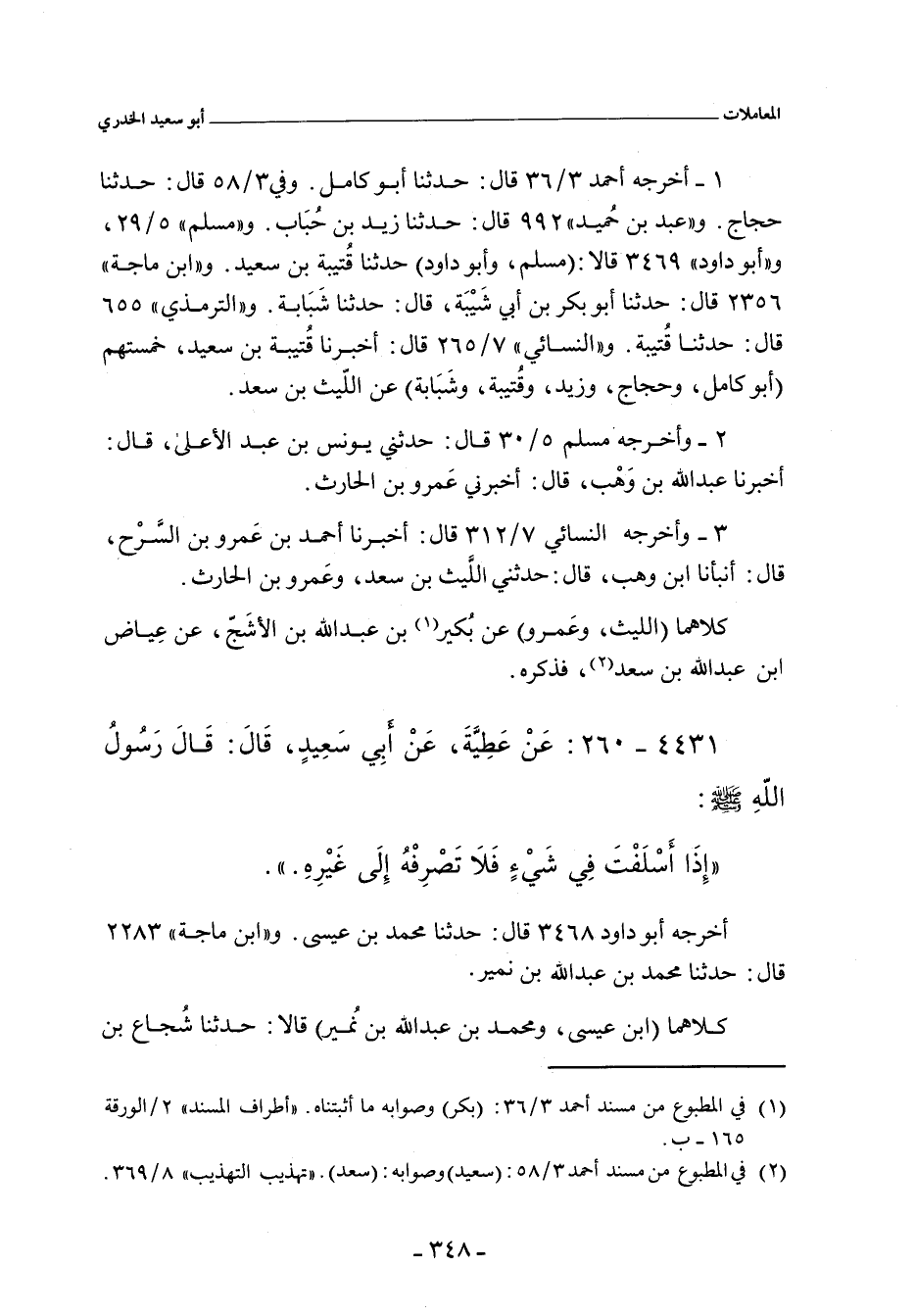 أخرجه أحمد ٣/ ٣٦ (١١٣٣٧) قال: حدَّثنا أبو كامل، حدَّثنا لَيْث بن سَعْد. وفي ٣/ ٥٨ (١١٥٧٢) قال: حدَّثنا حَجاج، حدَّثنا لَيْث. و"عَبد بن حُميد" ٩٩٢ قال: حدَّثنا زَيْد بن حُباب، عن لَيْث بن سَعْد. و"مسلم" ٥/ ٢٩ (٣٩٨٣) قال: حدَّثنا قُتَيْبَة بن سَعِيد، حدَّثنا لَيْث. وفي ٥/ ٣٠ (٣٩٨٤) قال: حدَّثني يُونُس بن عَبْد الأعَلى، أخبرنا عَبْد الله بن وَهْب، أخبرني عَمْرو بن الحارث. و"أبو داود" ٣٤٦٩ قال: حدَّثنا قُتَيْبَة بن سَعِيد، حدَّثنا اللَّيْث. و"ابن ماجة" ٢٣٥٦ قال: حدَّثنا أبو بَكْر بن أَبي شَيْبَة، حدَّثنا شَبَابة، حدَّثنا الليْث بن سَعْد. والتِّرْمِذِيّ" ٦٥٥ قال: حدَّثنا قُتَيْبَة، حدَّثنا الليْث. و"النَّسائي" ٧/ ٢٦٥، وفي "الكبرى" ٦٠٧٦ قال: أخبرنا قُتَيْبَة بن سَعِيد. قال: حدَّثنا اللَّيْث. وفي ٧/ ٣١٢، وفي "الكبرى" ٦٢٣٠ قال: أخبرنا أحمد بن عَمْرو بن السَّرْح، قال: أنبأنا ابن وَهْب، قال: حدَّثني الليْث بن سَعْد، وعَمْرو بن الحارث.