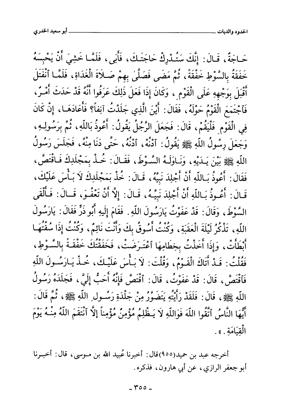 أَسُوقُ بِكَ وَأَنْتَ نَائم، وَكُنْتُ إِذَا سُقْتُهَا أَبطَأَتْ، وِإذَا أَخَذْتُ بِخِطَامِهَا اعْتَرَضَت، فَخَفَقْتُكَ خَفْقَةً بِالسَّوْطِ، فَقُلتُ: قَدْ أَتَاكَ الْقَوْمُ، وَقُلتَ: لا بأس عَلَيْكَ، خُذْ يَا رَسُولَ الله فَاقْتَصَّ، قَالَ: قَد عَفَوْتُ، قَالَ: اقْتَص فَإنَّهُ أَحَبُّ إلَي، فَجَلَدَهُ رسول الله صلى الله عليه وسلم، قال: فلقد رَأيْتهِ يَتَضَورُ مِنْ جَلدَةِ رَسُولِ اللهِ صلى الله عليه وسلم، ثم قَال: أيُّهَا النُّاسُ اتقُوا اللهَ فَوَاللهِ لا يظلم مُؤْمِنٌ مُؤْمِنًا إلَاّ اتَقَمَ اللهُ مِنْهُ يَوْمَ القِيَامَة.