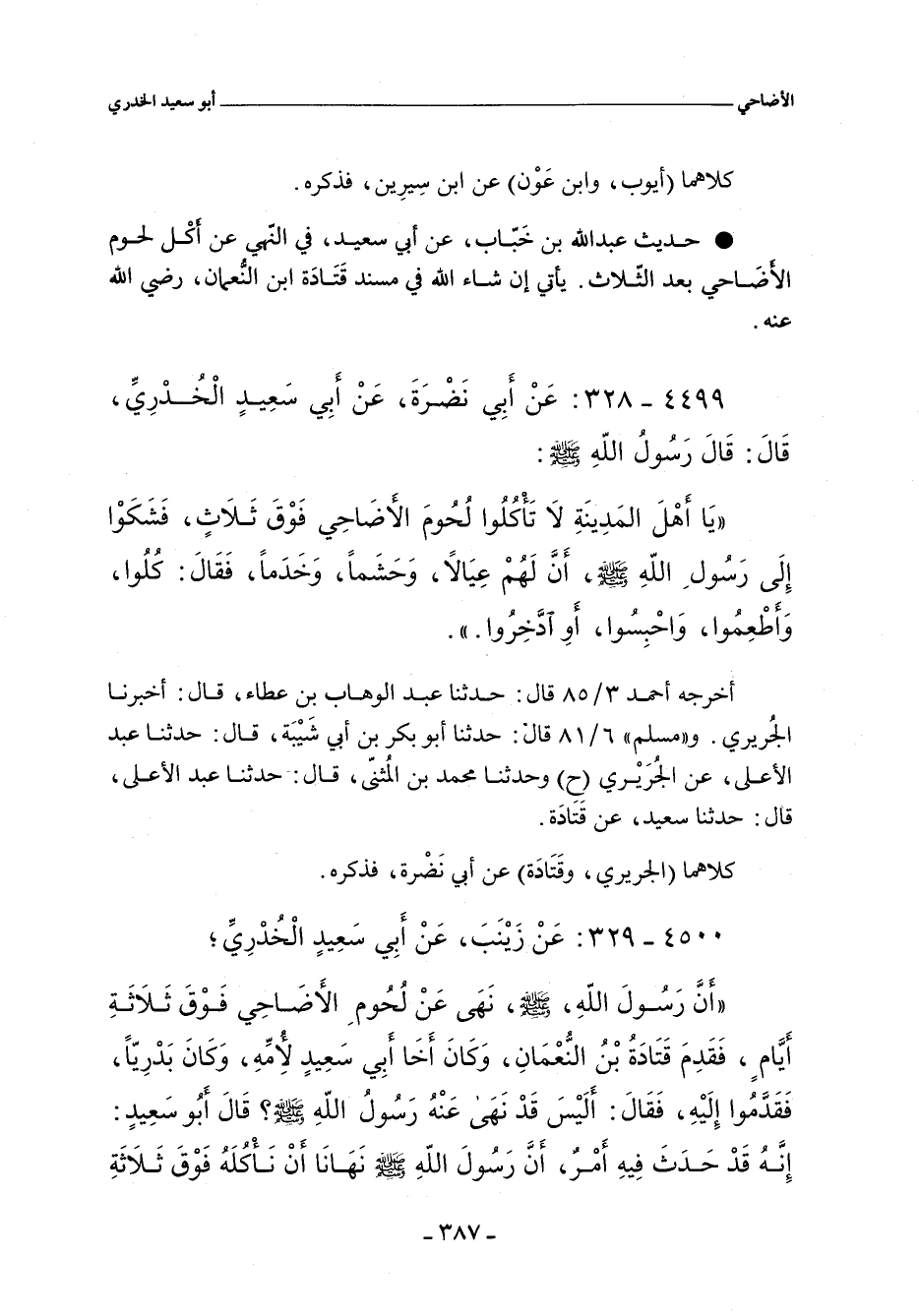 أَن رَسُولَ اللهِ صلى الله عليه وسلم، نَهَى عَنْ لُحُومِ اَلأضًاحِي فَوقَ ثَلَاثَةِ أَيامِ، فَقَدِمَ قَتَادَةُ بْنُ النُّعْمَانِ، وَكَانَ أَخَا أَبي سَعِيدٍ لأمُهِ، وَكَانَ بَدْرِيّا، فَقَدمُوا إِلَيْهِ، فَقَالَ: أَلَيْسَ قَذ نَهَى عَنْهُ رَسُولُ اللهِ صلى الله عليه وسلم؟ قَالَ أبو سَعِيدٍ: إنَّهُ قَد حَدَثَ فِيهِ أَمر، رَسُولَ اللهِ صلى الله عليه وسلم نَهَانَا أَنْ نَأكُلَهُ فَوْقَ ثَلَاثَةِ