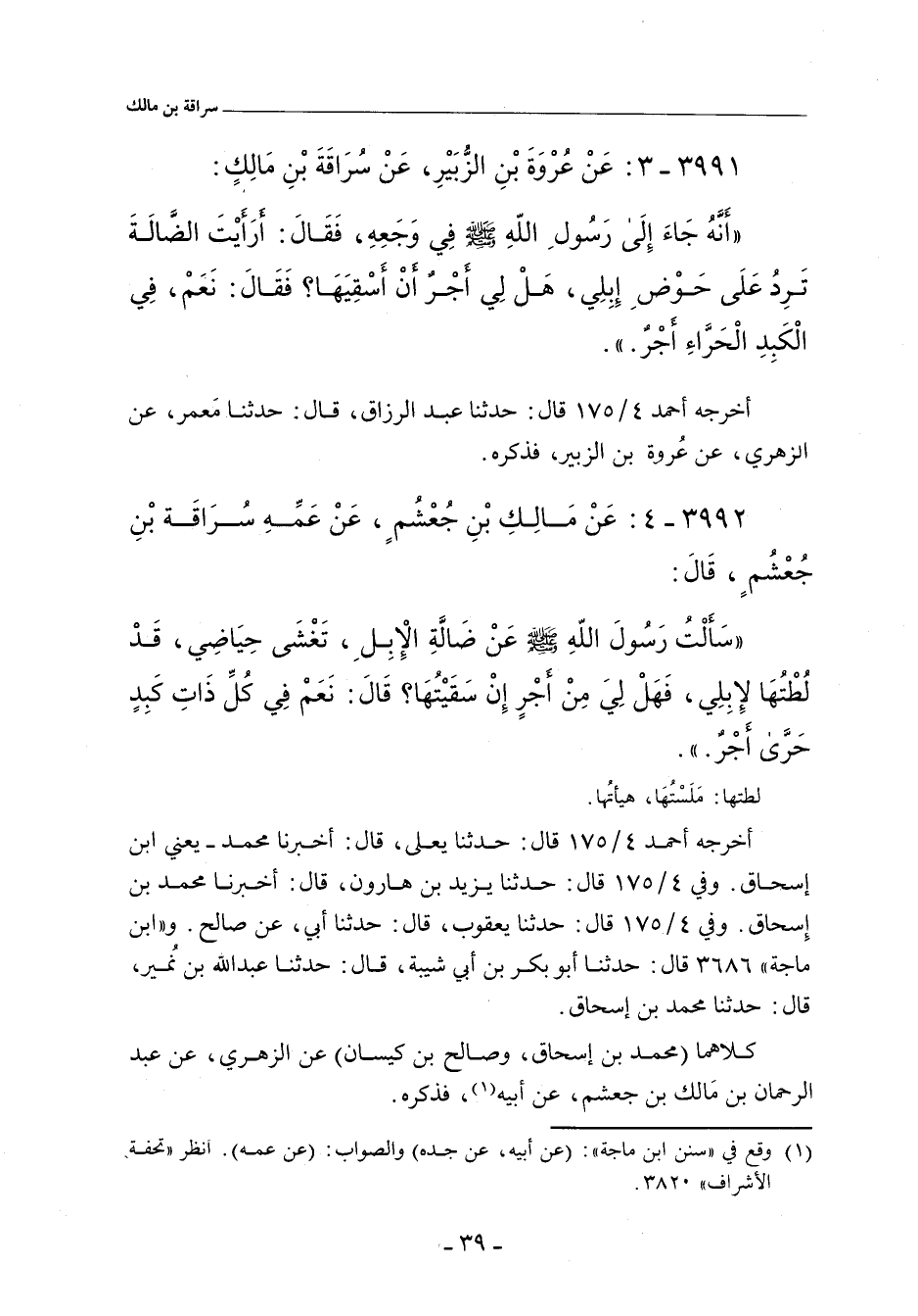٣٩٩١ - عَنْ عُرْوَةَ بْنِ الزُّبَيْرِ، عَنْ سُرَاقَةَ بْنِ مَالِكٍ؛
