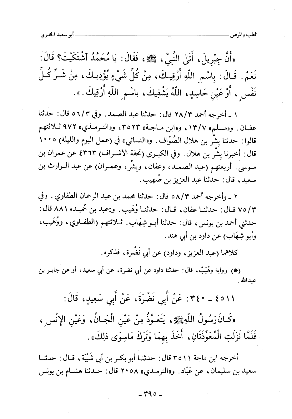 أَنَّ جِبْرَائِيلَ أَتَى النَّبِيَّ صلى الله عليه وسلم فَقَالَ يَا مُحَمَّدُ اشْتَكَيْتَ قَالَ نَعَمْ قَالَ بِسْمِ اللهِ أَرْقِيكَ مِنْ كُلِّ شَىْءٍ يُؤْذِيكَ مِنْ شَرِّ كُلِّ نَفْسٍ أَوْ عَيْنٍ أَوْ حَاسِدٍ اللهِ يَشْفِيكَ بِسْمِ اللهِ أَرْقِيكَ.