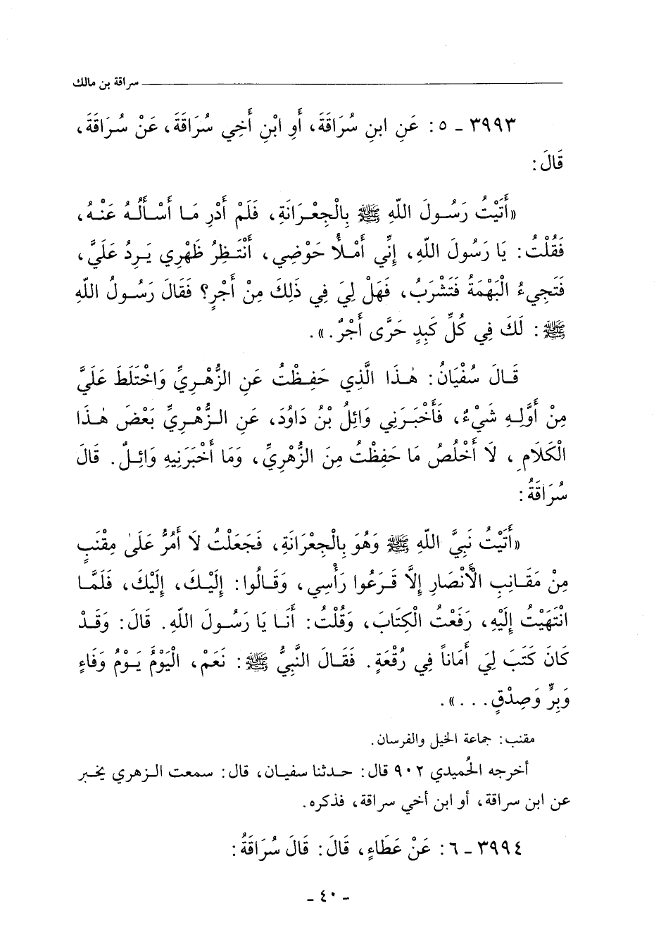 ٣٩٩٣ - عَنِ ابْنِ سُرَاقَةَ، أَوِ ابْنِ أَخِي سُرَاقَةَ، عَنْ سُرَاقَةَ، قَالَ: