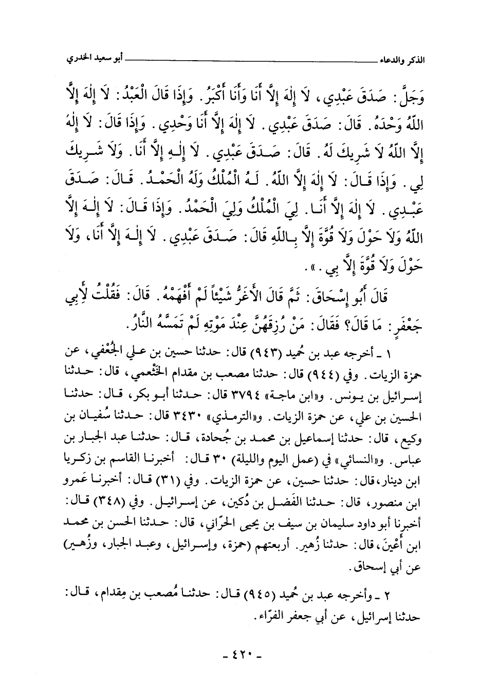 ١ - أخرجه عَبْد بن حُمَيْد (٩٤٣) قال: حدَّثنا حُسَيْن بن علي الجُعفي، عن حَمْزَة الزيات. وفي (٩٤٤) قال: حدَّثنا مُصْعَب بن مِقدام الخَثعمي، حدَّثنا إِسْرَائِيل بن يُونُس. و"ابن ماجة" ٣٧٩٤ قال: حدَّثنا أبو بَكْر، حدَّثنا الحُسَيْن بن علي، عن حَمْزَة الزيات. والتِّرْمِذِيّ" ٣٤٣٠ قال: حدَّثنا سُفْيان بن وَكِيع، حدَّثنا إِسْمَاعِيل بن مُحَمد بن جُحَادة، حدَّثنا عَبْد الجَبَّار بن عبّاس. و"النَّسائي" في "عمل اليوم والليلة" ٣٠ قال: أخبرنا القاسم بن زكريا بن دِينَار، قال: حدَّثنا حُسَيْن، عن حَمْزَة الزيات. وفي (٣١) قال: أخبرنا عَمْرو بن مَنْصُور، قال: حدَّثنا الفَضْل بن دُكين، عن إِسْرَائِيل. وفي (٣٤٨) قال: أخبرنا أبو داود سُلَيْمَان بن سَيف بن يَحيى الحرّاني، قال: حدَّثنا الحَسَن بن مُحَمد بن أَعينَ، قال: حدَّثنا زُهَيْر.