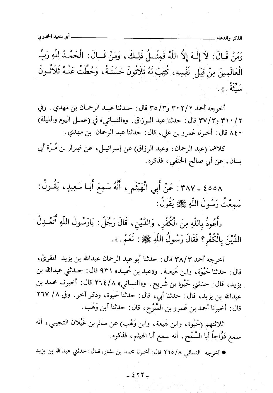 أَعُوذُ بِاللهِ مِنَ الْكُفْرِ وَالدَّيْنِ , فَقَالَ رَجُلٌ: يَا رَسُولَ اللهِ، أَتَعْدِلُ الدَّيْنُ بِالْكُفْرِ؟ فَقَالَ رَسُولُ اللهِ صلى الله عليه وسلم: نَعَمْ.