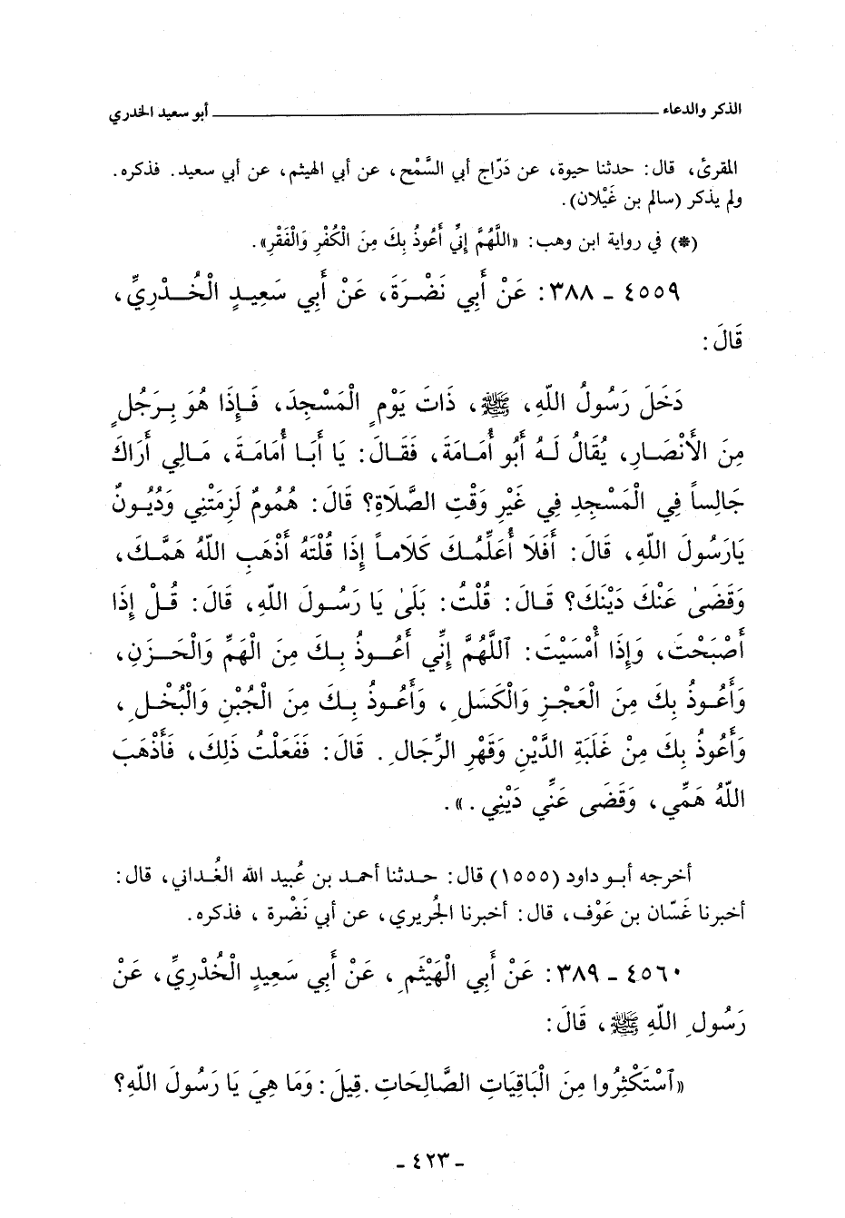 دَخَلَ رَسُولُ اللهِ صلى الله عليه وسلم ذَاتَ يَوْمٍ الْمَسْجِدَ فَإِذَا هُوَ بِرَجُلٍ مِنَ الأَنْصَارِ يُقَالُ لَهُ: أَبُو أُمَامَةَ فَقَالَ «يَا أَبَا أُمَامَةَ مَا لِي أَرَاكَ جَالِسًا فِي الْمَسْجِدِ فِي غَيْرِ وَقْتِ الصَّلَاةِ». قَالَ هُمُومٌ لَزِمَتْنِى وَدُيُونٌ يَا رَسُولَ اللهِ. قَالَ: أَفَلَا أُعَلِّمُكَ كَلَامًا إِذَا أَنْتَ قُلْتَهُ أَذْهَبَ اللَّهُ عَزَّ وَجَلَّ هَمَّكَ وَقَضَى عَنْكَ دَيْنَكَ». قَالَ قُلْتُ بَلَى يَا رَسُولَ اللهِ. قَالَ «قُلْ إِذَا أَصْبَحْتَ وَإِذَا أَمْسَيْتَ اللَّهُمَّ إِنِّي أَعُوذُ بِكَ مِنَ الْهَمِّ وَالْحَزَنِ وَأَعُوذُ بِكَ مِنَ الْعَجْزِ وَالْكَسَلِ وَأَعُوذُ بِكَ مِنَ الْجُبْنِ وَالْبُخْلِ وَأَعُوذُ بِكَ مِنْ غَلَبَةِ الدَّيْنِ وَقَهْرِ الرِّجَالِ». قَالَ فَفَعَلْتُ ذَلِكَ فَأَذْهَبَ اللَّهُ عَزَّ وَجَلَّ هَمِّى وَقَضَى عَنِّى دَيْنِى.