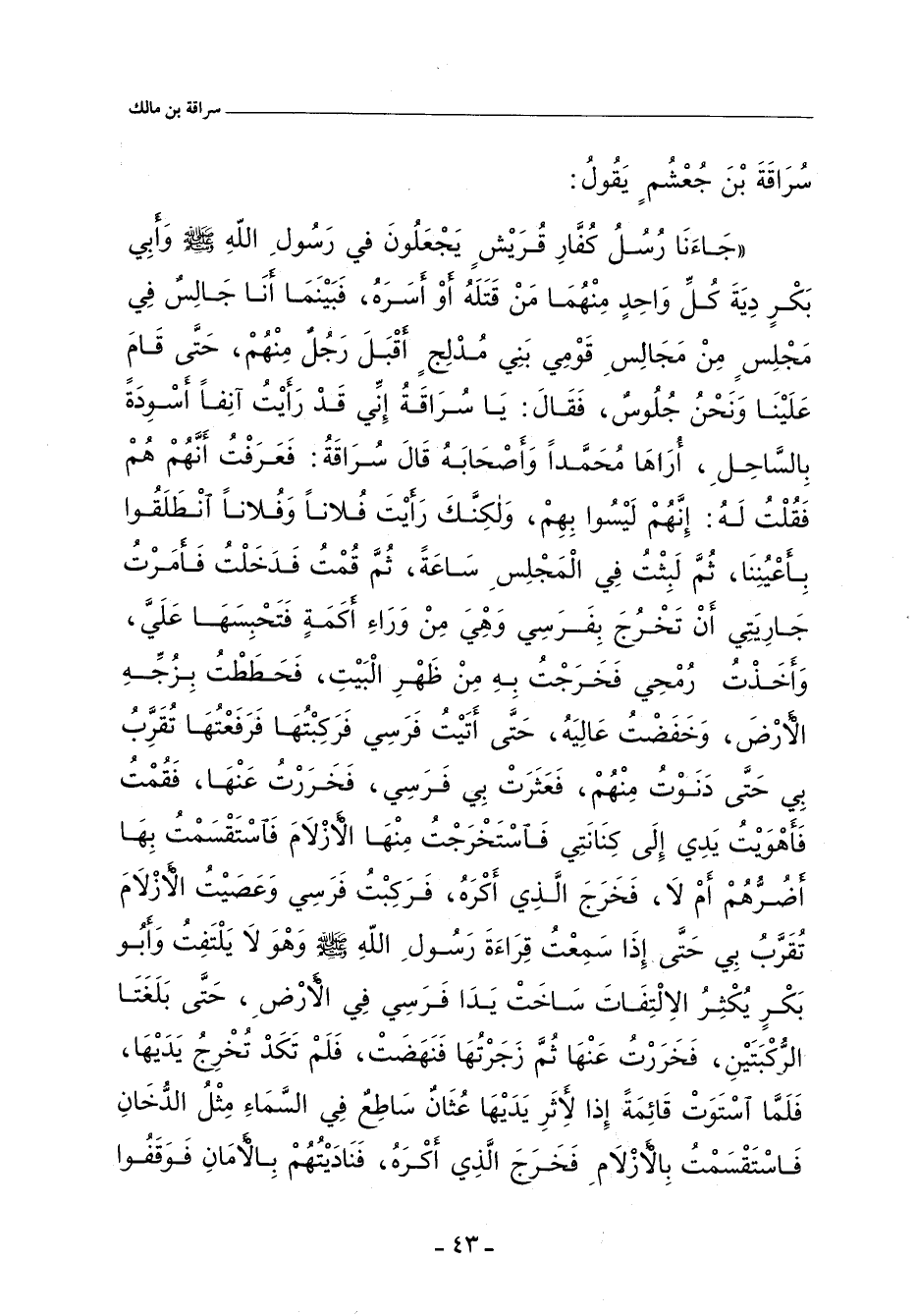 جَاءَنَا رُسُلُ كُفَّارِ قُرَيْشٍ، يَجْعَلُونَ فِي رَسُولِ اللهِ صلى الله عليه وسلم، وأَبي بَكْرٍ، دِيَةَ كُلِّ وَاحِدٍ مِنْهُمَا مَنْ قَتَلَهُ، أَوْ أَسَرَهُ، فَبَيْنَمَا أَنَا جَالِسٌ فِي مَجْلِسٍ مِنْ مَجَالِسِ قَوْمِي بَنِي مُدْلِجٍ، أَقْبَلَ رَجُلٌ مِنْهُمْ، حَتَّى قَامَ عَلَيْنَا، وَنَحْنُ جُلُوسٌ، فَقَالَ: يَا سُرَاقَةُ، إِنِّي قَدْ رَأَيْتُ آنِفًا أَسْوِدَةً بِالسَّاحِلِ، أُرَاهَا مُحَمدًا وَأَصْحَابَهُ، قَالَ سُرَاقَةُ: فَعَرَفْتُ أَنَّهُمْ هُمْ، فَقُلْتُ لَهُ: إِنَّهُمْ لَيْسُوا بِهِمْ، وَلَكِنَّكَ رَأَيْتَ فُلَانًا، وَفُلَانًا، انْطَلَقُوا بِأَعْيُنِنَا، ثُمَّ لَبِثْتُ فِي الْمَجْلِسِ سَاعَةً، ثُمَّ قُمْتُ فَدَخَلْتُ، فَأَمَرْتُ جَارِيَتِي أَنْ تَخْرُجَ بِفَرَسِي، وَهِيَ مِنْ وَرَاءِ أَكَمَةٍ، فَتَحْبِسَهَا عَلَيَّ، وَأَخَذْتُ رُمْحِي، فَخَرَجْتُ بِهِ مِنْ ظَهْرِ الْبَيْتِ، فَحَطَطْتُ بِزُجِّهِ الأَرْضَ، وَخَفَضْتُ عَالِيَهُ، حَتَّى أَتَيْتُ فَرَسِي، فَرَكِبْتُهَا فَرَفَعْتُهَا تُقَرِّبُ بِي، حَتَّى دَنَوْتُ مِنْهُمْ، فَعَثَرَتْ بِي فَرَسِي، فَخَرَرْتُ عَنْهَا، فَقُمْتُ فَأَهْوَيْتُ يَدِي إِلَى كِنَانَتِي، فَاسْتَخْرَجْتُ مِنْهَا الأَزْلَامَ، فَاسْتَقْسَمْتُ بِهَا أَضُرُّهُمْ أَمْ لَا، فَخَرَجَ الَّذِي أَكْرَهُ، فَرَكِبْتُ فَرَسِي وَعَصَيْتُ الأَزْلَامَ تُقَرِّبُ بِي، حَتَّى إِذَا سَمِعْتُ قِرَاءَةَ رَسُولِ اللهِ صلى الله عليه وسلم، وَهُوَ لَا يَلْتَفِتُ، وَأَبُو بَكْرٍ يُكْثِرُ الاِلْتِفَاتَ، سَاخَتْ يَدَا فَرَسِي فِي الأَرْضِ، حَتَّى بَلَغَتَا الرُّكْبَتَيْنِ، فَخَرَرْتُ عَنْهَا، ثُمَّ زَجَرْتُهَا فَنَهَضَتْ، فَلَمْ