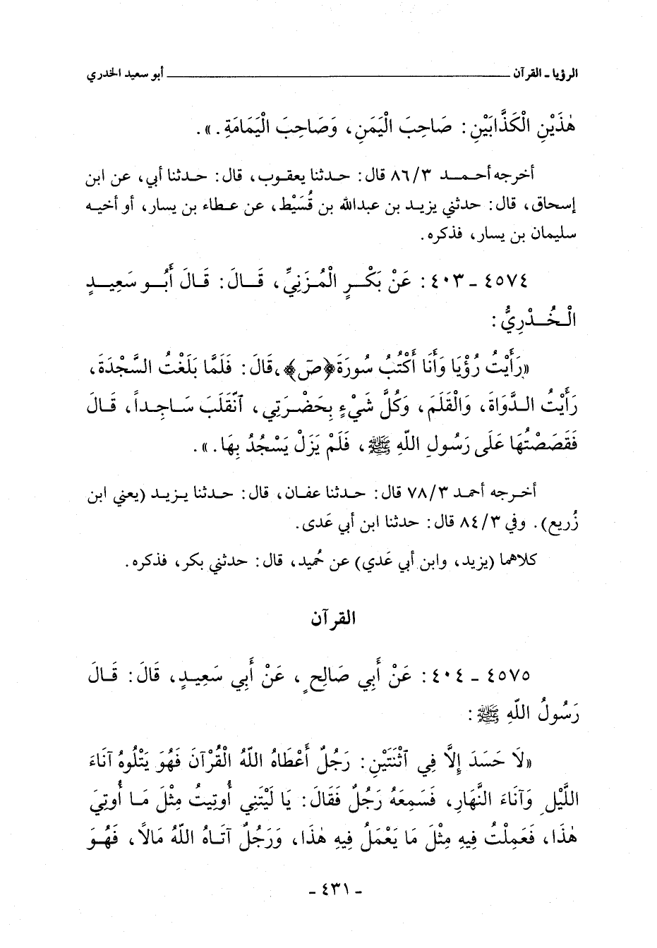 أَنَّ أَبَا سَعِيدٍ الْخُدْرِيَّ رَأَى رُؤْيَا أَنَّهُ يَكْتُبُ (ص)، فَلَمَّا بَلَغَ إِلَى سَجْدَتِهَا قَالَ: رَأَى الدَّوَاةَ وَالْقَلَمَ وَكُلَّ شَيْءٍ بِحَضْرَتِهِ انْقَلَبَ سَاجِدًا، قَالَ: فَقَصَّهَا عَلَى النَّبِيِّ صلى الله عليه وسلم، فَلَمْ يَزَلْ يَسْجُدُ بِهَا بَعْدُ.