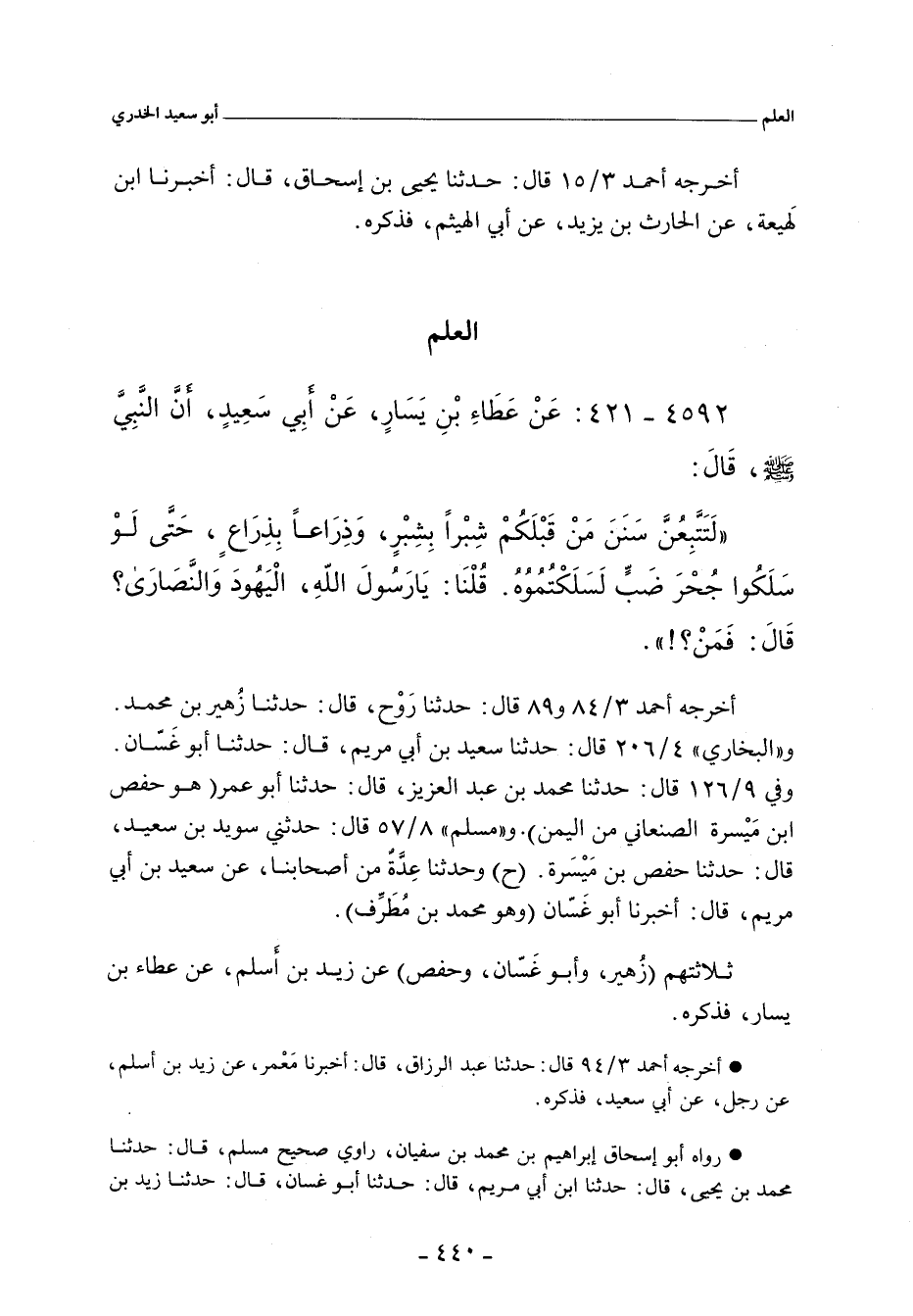 لَتَتُّبِعُن سَنَنَ مَنْ قَبْلَكُمْ، شِبْرًا بِشِبْرٍ، وَذِرَاعًا بِذِرَاع، حَتَّى لَوْ سَلَكُوا جُحْرَ ضَبّ لَسَلَكْتُمُوهُ، قُلْنَا: يَا رَسُولَ اللهِ، اَلْيَهُودَ وَاَلنُّصَارَى؟ قَالَ: فَمَنْ؟!.