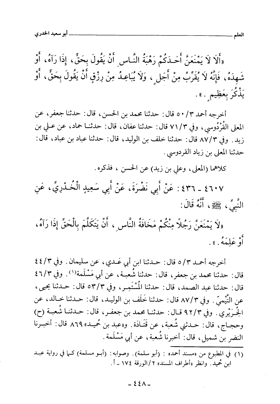 لَا يَمْنَعَنَّ رَجُلاً مِنْكُمْ مَخَافَةُ النَّاسِ , أَنْ يَتَكَلَّمَ بِالْحَقِّ إِذَا رَآهُ أَوْ عَلِمَهُ.