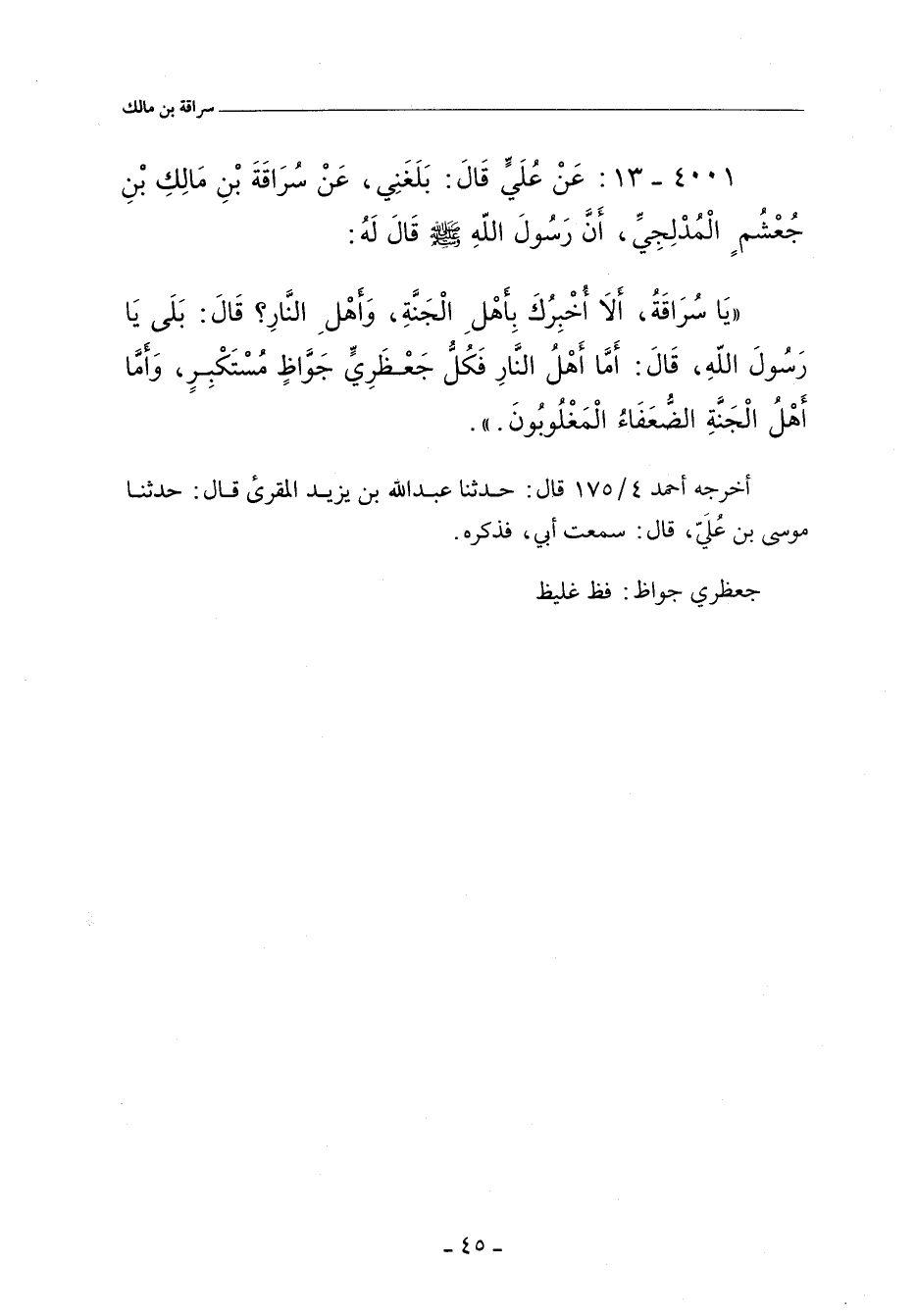 يَا سُرَاقَةُ، أَلَا أُخْبِرُكَ بِأَهْلِ الْجَنَّةِ وَأَهْلِ النَّارِ؟ قَالَ: بَلَى، يَا رَسُولَ اللهِ، قَالَ: أَمَّا أَهْلُ النَّارِ، فَكُلُّ جَعْظَرِيٍّ جَوَّاظٍ مُسْتَكْبِرٍ، وَأَمَّا أَهْلُ الْجَنَّةِ الضُّعَفَاءُ الْمَغْلُوبُونَ.