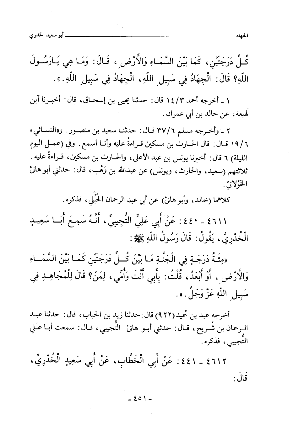 كُل دَرَجَتَيْن، كَمَا بَيْنَ اَلسَّمَاءِ وَآلأَرْض، قَال. وَمَا هِيِ يَا رَسُولَ اللهِ؟ قَالَ: اَلْجِهَادُ فِي سَبِيلِ اللهِ، الْجِهَادُ فِي سَبِيلِ اللهِ.