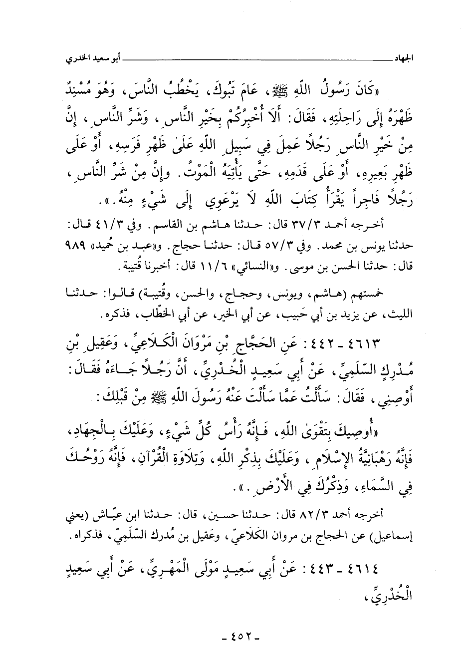 ٤٦١٣ - عَنِ الْحَجَّاجِ بْنِ مَرْوَانَ الكَلَاعِىِّ وَعَقِيلِ بْنِ مُدْرِكٍ السُّلَمِىِّ عَنْ أَبِى سَعِيدٍ الْخُدْرِىِّ أَنَّ رَجُلاً جَاءَهُ فَقَالَ أَوْصِنِى فَقَالَ سَأَلْتَ عَمَّا سَأَلْتُ عَنْهُ رَسُولَ اللَّهِ صلى اللهِ عليه وسلم مِنْ قَبْلِكَ: