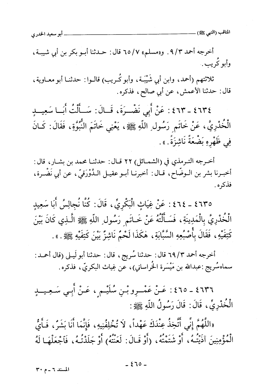 ٤٦٣٥ - عَنْ غِيَاثٍ الْبَكْرِىِّ قَالَ: كُنَّا نُجَالِسُ أَبَا سَعِيدٍ الْخُدْرِىَّ بِالْمَدِينَةِ , فَسَأَلْتُهُ عَنْ خَاتَمِ رَسُولِ اللَّهِ صلى الله عليه وسلم الَّذِى كَانَ بَيْنَ كَتِفَيْهِ , فَقَالَ بِأُصْبُعِهِ السَّبَّابَةِ , هَكَذَا لَحْمٌ نَاشِزٌ بَيْنَ كَتِفَيْهِ.