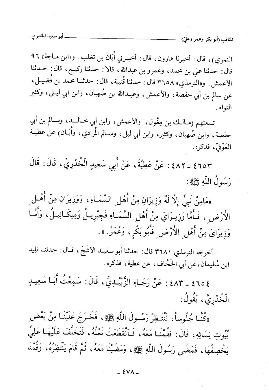 النَّمْري، أخبرنا هارون، أخبرني أَبَان بن تَغلب. و"ابن ماجة" ٩٦ قال: حدَّثنا علي بن مُحَمد، وعَمْرو بن عَبْد اللهِ، قالا: حدَّثنا وَكِيع، حدَّثنا وَكِيع , حدَّثنا الأَعْمَش. والتِّرْمِذِيّ" ٣٦٥٨ قال: حدَّثنا قُتَيْبَة، حدَّثنا مُحَمد بن فُضَيْل، عن سالم بن أَبي حَفْصة، والأَعْمَش، وعَبْد اللهِ بن صُهبان، وابن أَبي لَيْلَى، وكَثِير النَّواء.