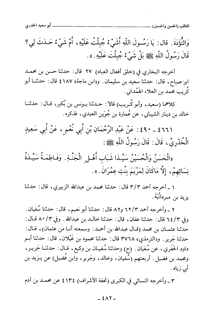 أخرجه أحمد ٣/ ٣ (١١٠١٢) قال: حدَّثنا مُحَمد بن عَبْد اللهِ الزُّبَيْرِي، حدَّثنا يَزِيد بن مَرْدَالبة. وفي ٣/ ٦٢ (١١٦١٦) و ٣/ ٨٢ (١١٧٩٩) قال: حدَّثنا أبو نُعَيْم، حدَّثنا سُفْيان، عن يَزِيد بن أَبي زِيَاد. وفي ٣/ ٦٤ (١١٦٤١) قال: حدَّثنا عَفَان، قال: حدَّثنا خالد بن عَبْد اللهِ، حدَّثنا يَزِيد بن أَبي زِيَاد. وفي ٣/ ٨٠ (١١٧٧٨) قال: حدَّثنا عُثْمَان بن مُحَمد (قال عَبْد اللهِ بن أحمد: وسَمِعْتُهُ أنا من عُثْمَان)، حدَّثنا جَرِير، عن يَزِيد. والتِّرْمِذِيّ" ٣٧٦٨ قال: حدَّثنا محمود بن غَيْلَان، حدَّثنا أبو داود الحَفَري، عن سُفْيان، عن يَزِيد بن أَبي زِيَاد (ح) وحدَّثنا سُفْيان بن وَكِيع، حدَّثنا جَرِير، ومُحَمد بن فُضَيْل، عن يَزِيد، و"النَّسائي" في "الكبرى" ٨١١٣ قال: أخبرنا مُحَمد بن آدم