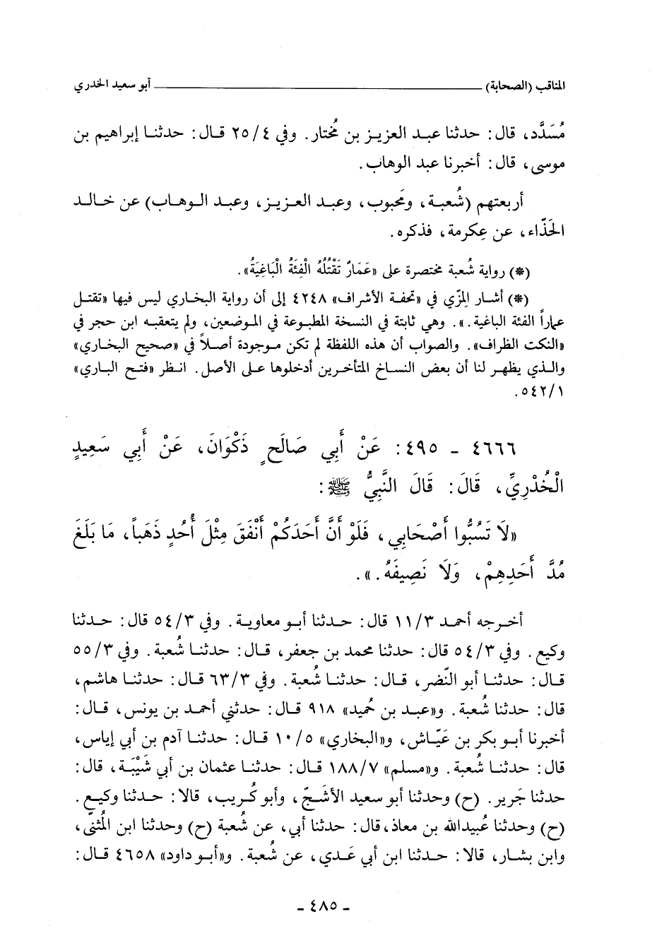 أخرجه أحمد ٣/ ١١ (١١٠٩٥) قال: حدَّثنا أبو مُعَاوِيَة. وفي ٣/ ٥٤ (١١٥٣٦) قال: حدَّثنا وَكِيع. وفي ٣/ ٥٤ (١١٥٣٧) قال: حدَّثنا مُحَمد بن جَعْفَر، حدَّثنا شُعْبة. وفي ٣/ ٥٥ (١١٥٣٨) قال: حدَّثنا أبو النضر، حدَّثنا شُعْبة. وفي ٣/ ٦٣ (١١٦٣٠) قال: حدَّثنا هاشم، حدَّثنا شُعْبة. و"عَبد بن حُميد" ٩١٨ قال: حدَّثني أحمد بن يُونُس، أخبرنا أبو بَكْر بن عَيّاش. و"البُخَارِي" ٥/ ١٠ (٣٦٧٣) قال: حدَّثنا آدم بن أَبي إِيَاس، حدَّثنا شُعْبة. و"مسلم" ٧/ ١٨٨ (٦٥٨٠) قال: حدَّثنا عُثْمَان بن أَبي شَيْبَة، حدَّثنا جَرِير. وفي ٧/ ١٨٨ (٦٥٨١) قال: حدَّثنا أبو سَعِيد الأَشَجّ، وأبو كُرَيْب، قالا: حدَّثنا وَكِيع (ح) وحدَّثنا عُبَيْد اللهِ بن مُعَاذ، حدَّثنا أَبي (ح) وحدَّثنا ابن المُثَنَّى، وابن بَشَّار، قالا: حدَّثنا ابن أَبي عَدِي، جميعًا , عن شُعْبة. و"أبو داود" ٤٦٥٨ قال: