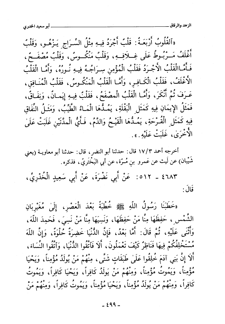الْقُلُوبُ أَرْبَعَةٌ قَلْبٌ أجْرَدُ فِيهِ مِثْلُ السِّرَاجِ يُزْهِرُ وَقَلَبٌ أَغْلَفُ مَرْبُوطٌ عَلَى غِلَافِهِ وَقَلْبٌ مَنْكُوسٌ وَقَلَبٌ مُصْفَحٌ فَأَمَّا الْقَلْبُ الأَجْرَدُ فَقَلْبُ الْمُؤْمِنِ سِرَاجُهُ فِيهِ نُورُهُ وَأَمَّا الْقَلْبُ الأَغْلَفُ فَقَلْبُ الْكَافِرِ وَأَمَّا الْقَلْبُ المَنْكُوسُ فَقَلْبُ الْمُنَافِقِ عَرَفَ ثُمَّ أَنْكَرَ وَأَمَّا الْقَلْبُ المُصْفَحُ فَقَلْبٌ فِيهِ إِيمَانٌ وَنِفَاقٌ فَمَثَلُ الإِيمَانِ فِيهِ كَمَثَلِ الْبَقْلَةِ يَمُدُّهَا الْمَاءُ الطَّيِّبُ وَمَثَلُ النِّفَاقِ فِيهِ كَمَثَلِ الْقُرْحَةِ يَمُدُّهَا الْقَيْحُ وَالدَّمُ فَأَىُّ الْمَدَّتَيْنِ غَلَبَتْ عَلَى الأُخْرَى غَلَبَتْ عَلَيْهِ.