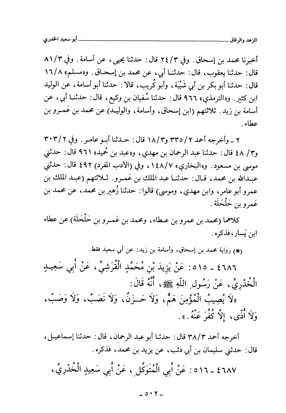 حدَّثنا مُحَمد بن إِسْحَاق. وفي ٣/ ٢٤ (١١٢٠٦) قال: حدَّثنا يَحيى، عن أُسَامة. وفي ٣/ ٨١ (١١٧٩٢) قال: حدَّثنا يَعْقُوب، حدَّثنا أَبي، عن مُحَمد بن إِسْحَاق. والتِّرْمِذِيّ" ٩٦٦ قال: حدَّثنا سُفْيان بن وَكِيع، حدَّثنا أَبي، عن أُسَامة بن زَيْد.