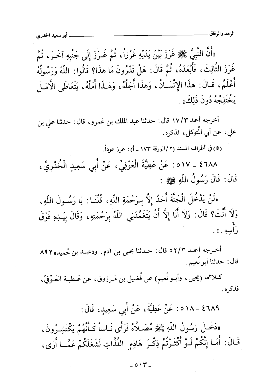 ٤٦٨٨ - عَنْ عَطِيَّةَ الْعَوْفِىِّ عَنْ أَبِى سَعِيدٍ الْخُدْرِىِّ قَالَ: قَالَ رَسُولُ اللَّهِ صلى الله عليه وسلم: