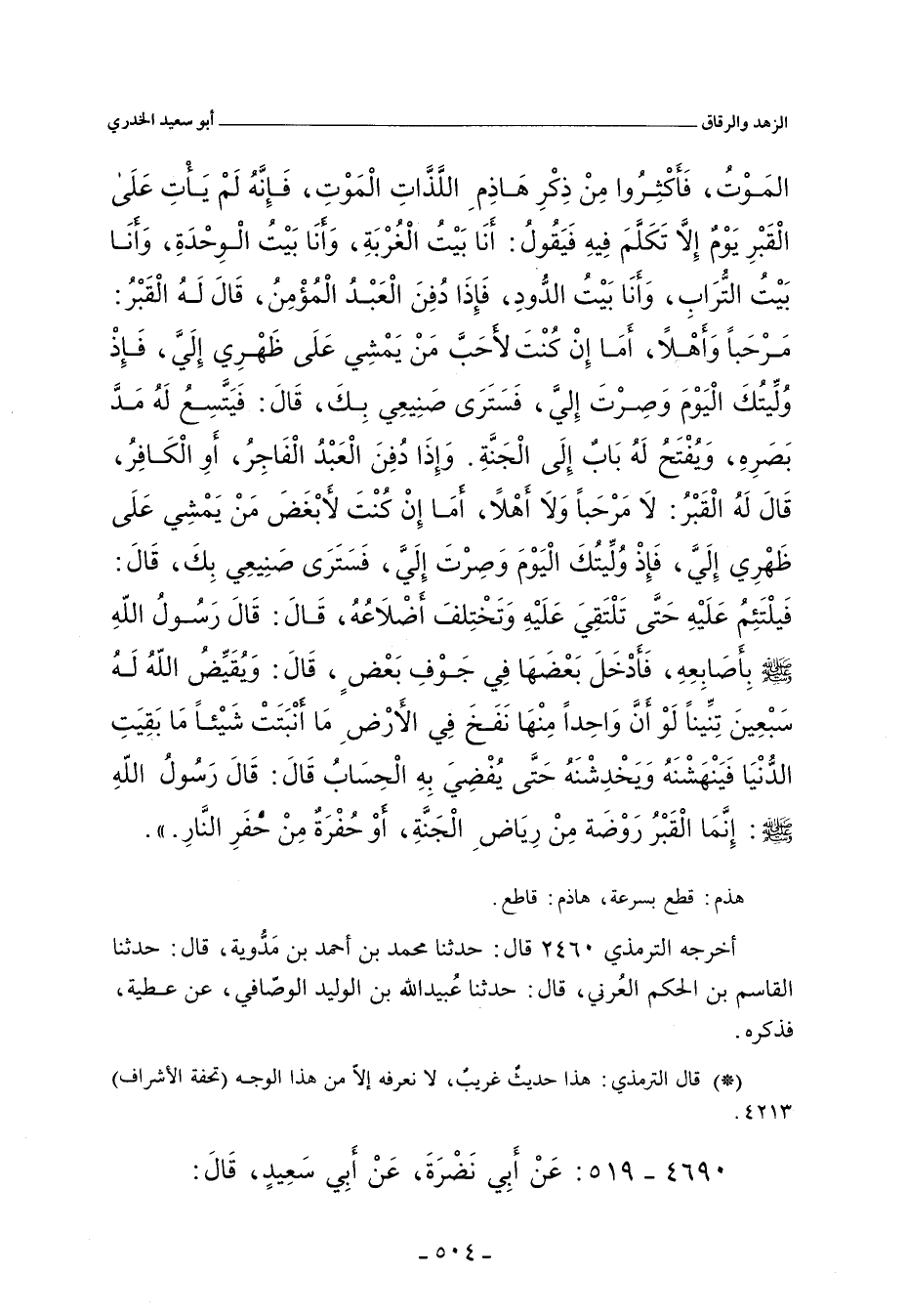 - قال أبو عِيسَى التِّرْمِذِي: هذا حديثٌ غريبٌ، لا نعرفُه إلا مِنْ هذا الوجه.