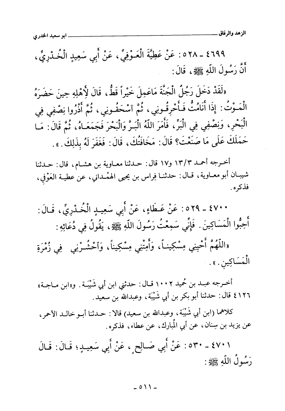 ٤٦٩٩ - عَنْ عَطِيَّةَ العَوْفِىِّ، عَنْ أَبِى سَعِيدٍ الْخُدْرِىِّ، أَنَّ رَسُولَ اللهِ صلى الله عليه وسلم، قَالَ: