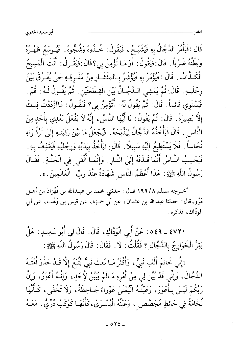 ٤٧٢٠ - عَنْ أَبِى الْوَدَّاكِ، قَالَ: قَالَ لِى أَبُو سَعِيدٍ: هَلْ يُقِرُّ الْخَوَارِجُ بِالدَّجَّالِ؟ فَقُلْتُ: لَا. فَقَالَ: قَالَ رَسُولُ اللهِ صلى الله عليه وسلم: