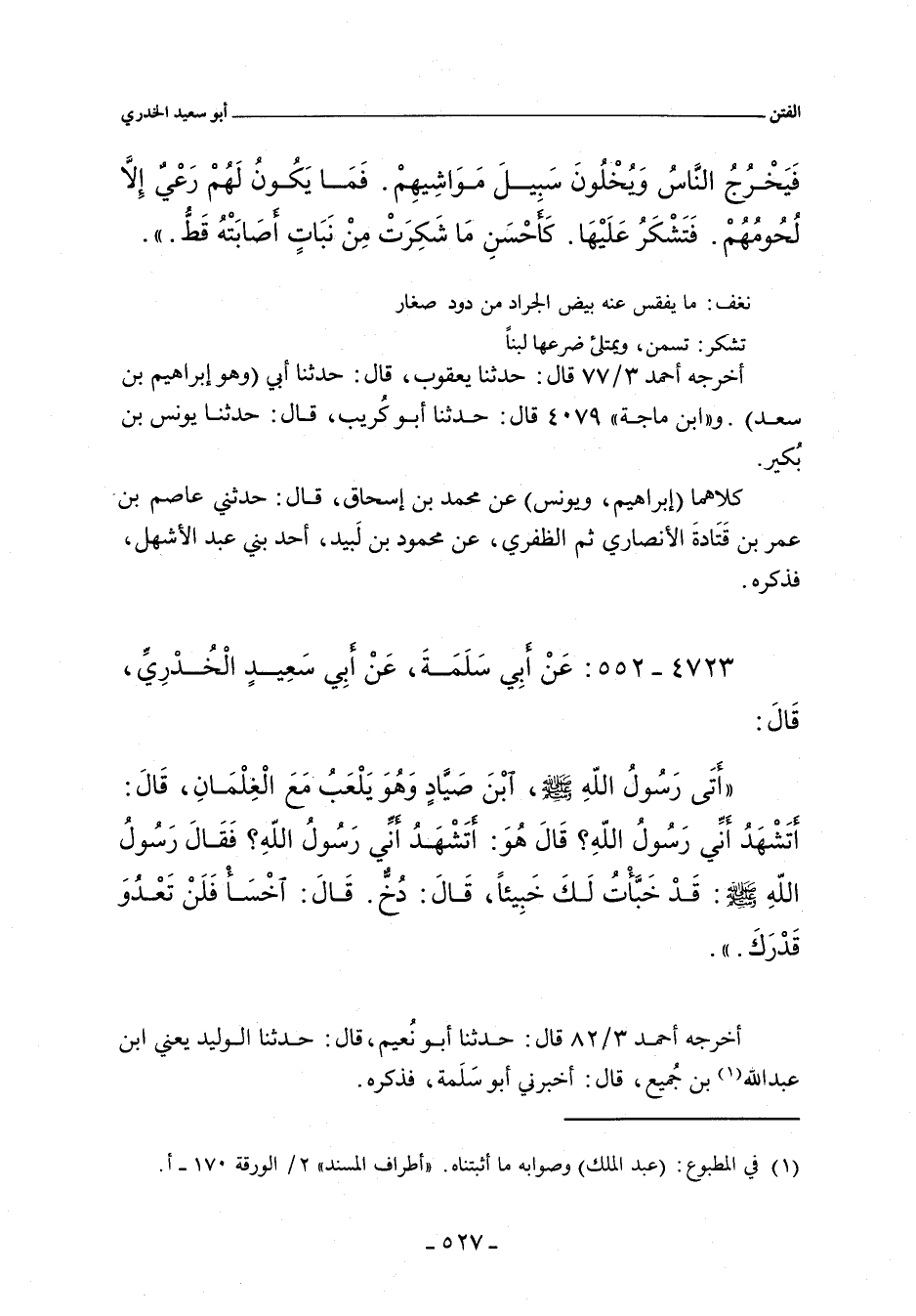 أَتَى رَسُولُ اللهِ صلى الله عليه وسلم، ابْنَ صَيَّادٍ وَهُوَ يَلْعَبُ مَعَ الْغِلْمَانِ، قَالَ: أَتَشْهَدُ أَنِّى رَسُولُ اللهِ؟ قَالَ هُوَ: أَتَشْهَدُ أَنِّى رَسُولُ اللهِ؟ فَقَالَ رَسُولُ اللهِ صلى الله عليه وسلم: قَدْ خَبَأْتُ لَكَ خَبِيئًا، قَالَ: دُخٌّ. قَالَ: اخْسَأْ فَلَنْ تَعْدُوَ قَدْرَكَ.