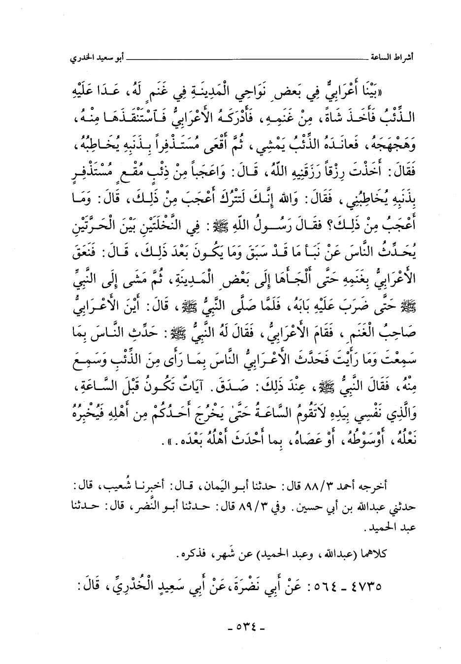 بَيْنَا أَعْرَابِىٌّ، فِى بَعْضِ نَوَاحِى الْمَدِينَةِ، فِى غَنَمٍ لَهُ، عَدَا عَلَيْهِ الذِّئْبُ فَأَخَذَ شَاةً، مِنْ غَنَمِهِ، فَأَدْرَكَهُ الأَعْرَابِىُّ، فَاسْتَنْقَذَهَا مِنْهُ، وَهَجْهَجَهُ، فَعَانَدَهُ الذِّئْبُ يَمْشِى، ثُمَّ أَقْعَى مُسْتَذْفِرًا بِذَنَبِهِ يُخَاطِبُهُ، فَقَالَ: أَخَذْتَ رِزْقًا رَزَقَنِيهِ اللهُ، قَالَ: وَاعَجَبًا مِنْ ذِئْبٍ مُقْعٍ مُسْتَذْفِرٍ بِذَنَبِهِ يُخَاطِبُنِى، فَقَالَ: وَاللهِ إِنَّكَ لَتَتْرُكُ أَعْجَبَ مِنْ ذَلِكَ، قَالَ: وَمَا أَعْجَبُ مِنْ ذَلِكَ؟ فَقَالَ: رَسُولُ اللهِ صلى الله عليه وسلم فِى النَّخَلَاتِ بَيْنَ الْحَرَّتَيْنِ، يُحَدِّثُ النَّاسَ عَنْ نَبَإِ مَا قَدْ سَبَقَ، وَمَا يَكُونُ بَعْدَ ذَلِكَ، قَالَ: فَنَعَقَ الأَعْرَابِىُّ بِغَنَمِهِ، حَتَّى أَلْجَأَهَا إِلَى بَعْضِ الْمَدِينَةِ، ثُمَّ مَشَى إِلَى النَّبِىِّ صلى الله عليه وسلم، حَتَّى ضَرَبَ عَلَيْهِ بَابَهُ، فَلَمَّا صَلَّى النَّبِىُّ صلى الله عليه وسلم، قَالَ: أَيْنَ الأَعْرَابِىُّ صَاحِبُ الْغَنَمِ، فَقَامَ الأَعْرَابِىُّ، فَقَالَ لَهُ النَّبِىُّ صلى الله عليه وسلم: حَدِّثِ النَّاسَ بِمَا سَمِعْتَ وَمَا رَأَيْتَ. فَحَدَّثَ الأَعْرَابِىُّ النَّاسَ بِمَا رَأَى مِنَ الذِّئْبِ وَسَمِعَ مِنْهُ، فَقَالَ النَّبِىُّ صلى الله عليه وسلم عِنْدَ ذَلِكَ: صَدَقَ، آيَاتٌ تَكُونُ قَبْلَ السَّاعَةِ، وَالَّذِى نَفْسِى بِيَدِهِ، لَا تَقُومُ السَّاعَةُ حَتَّى يَخْرُجَ أَحَدُكُمْ مِنْ أَهْلِهِ، فَيُخْبِرَهُ نَعْلُهُ، أَوْ سَوْطُهُ، أَوْ عَصَاهُ، بِمَا أَحْدَثَ أَهْلُهُ بَعْدَهُ.