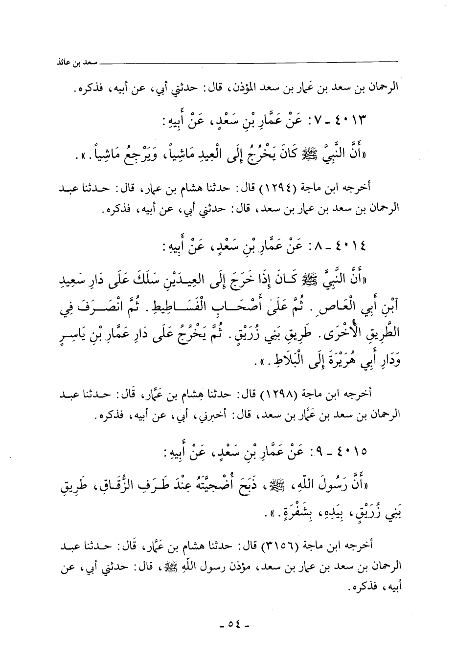 أَنَّ النَّبِيَّ صلى الله عليه وسلم كَانَ إِذَا خَرَجَ إِلَى الْعِيدَيْنِ، سَلَكَ عَلَى دَارِ سَعِيدِ بْنِ أَبِي الْعَاصِ، ثُمَّ عَلَى أَصْحَابِ الْفَسَاطِيطِ، ثُمَّ انْصَرَفَ فِي الطَّرِيقِ الأُخْرَى، طَرِيقِ بَنِي زُرَيْقٍ، ثُمَّ يَخْرُجُ عَلَى دَارِ عَمَّارِ بْنِ يَاسِرٍ، وَدَارِ أَبِي هُرَيْرَة إِلَى الْبَلَاطِ.