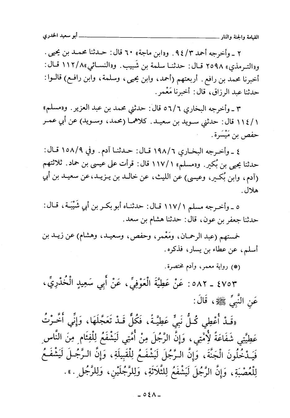 وفي ٣/ ٩٤ (١١٩٢٠) قال: حدَّثنا عَبْد الرَّزَّاق، أنبأنا مَعْمَر. و"البُخَارِي" ٦/ ٥٦ (٤٥٨١) قال: حدَّثني مُحَمد بن عَبْد العَزِيز، حدَّثنا أبوعُمر حَفْص بن مَيْسَرَة. وفي ٦/ ١٩٨ (٤٩١٩) قال: حدَّثنا آدم، حدَّثنا اللَّيْث، عن خالد بن يَزِيد، عن سَعِيد بن أَبي هِلَال. وفي ٩/ ١٥٨ (٧٤٣٩) قال: حدَّثنا يَحيى بن بُكَيْر، حدَّثنا اللَّيْث، عن خالد بن بزيد، عن سَعِيد بن أَبي هِلَال. و"مسلم" ١/ ١١٤ (٣٧٤) قال: حدَّثني سُوَيْد بن سَعِيد، قال: حدَّثني حَفْص بن مَيْسَرَة. وفي ١/ ١١٧ (٣٧٥) قرأْتُ على عِيسَى بن حمَّاد زُغبَةَ المِصْري هذا الحديث في الشَّفاعة. وقلتُ له أُحدث بهذا عنك، أنك سمعتَ من اللَّيْث بن سَعْد؟ فقال: نعم. قلتُ لعيسى بن حَمَّاد: أخبركم اللَّيْث بن سَعْد، عن خالد بن يَزِيد، عن سَعِيد بن أَبي هِلَال. وفي ١/ ١٧٧ (٣٧٦) قال: وحدَّثناه أبو بَكْر بن أَبي شَيْبَة، حدَّثنا جَعْفَر بن عَوْن، حدَّثنا هِشَام بن سَعْد. و"ابن ماجة" ٦٠ حدَّثنا مُحَمد بن يَحيى، حدَّثنا عَبْد الرَّزَّاق، أنبأنا مَعْمَر. والتِّرْمِذِيّ" ٢٥٩٨ قال: حدَّثنا سَلَمَة بن شَبِيب، حدَّثنا. عَبْد الرَّزَّاق، أخبرنا مَعْمَر. و"النَّسائي" ٨/ ١١٢ قال: أخبرنا مُحَمد بن رافع، قال: حدَّثنا عَبْد الرَّزَّاق، قال: أنبأنا مَعْمَر.