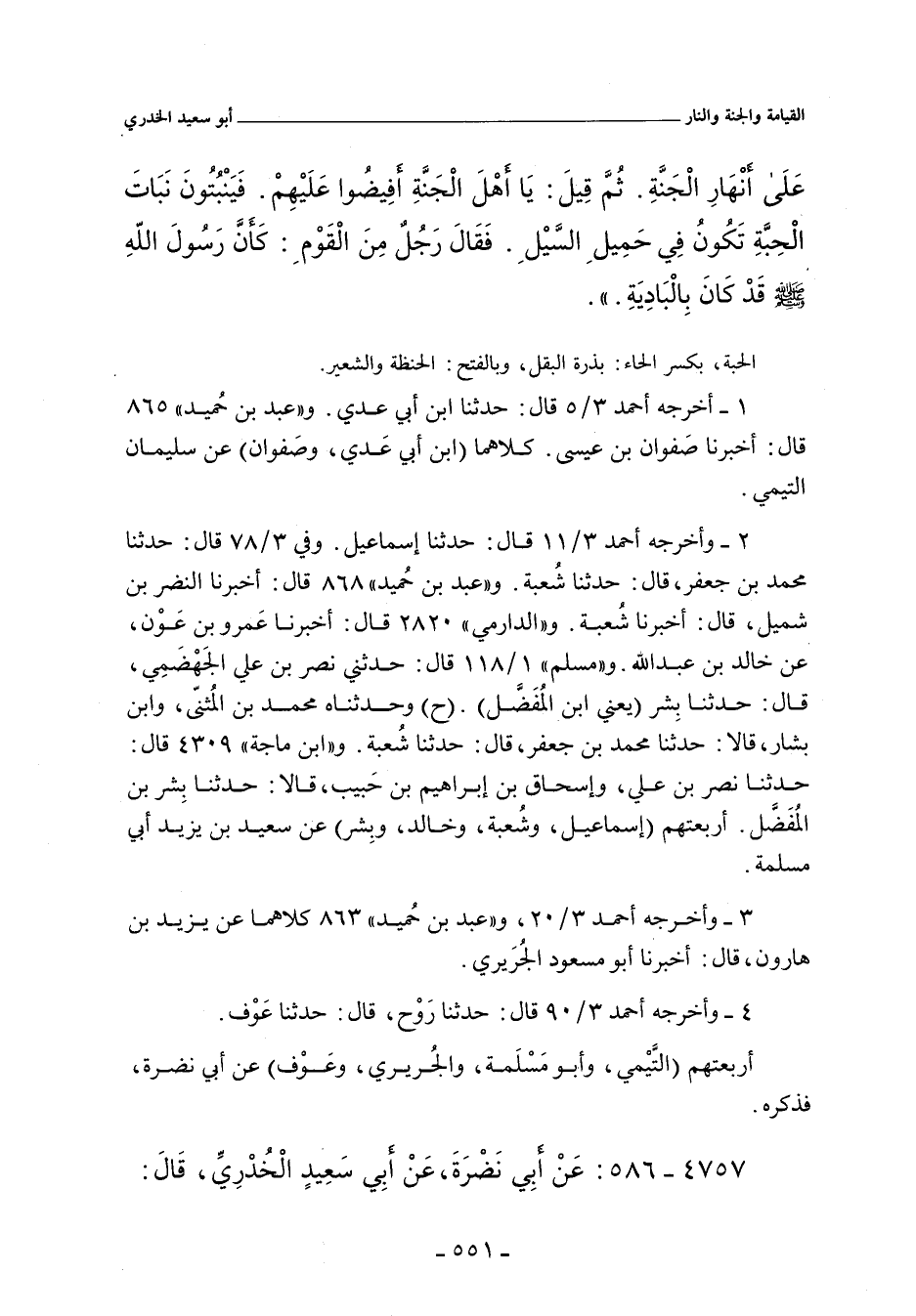 عَلَى أَنْهَارِ الْجَنَّةِ، ثُمَّ قِيلَ: يَا أَهْلَ الْجَنَّةِ، أَفِيضُوا عَلَيْهِمْ، فَيَنْبُتُونَ نَبَاتَ الْحِبَّةِ تَكُونُ فِى حَمِيلِ السَّيْلِ. فَقَالَ رَجُلٌ مِنَ الْقَوْمِ: كَأَنَّ رَسُولَ اللهِ صلى الله عليه وسلم قَدْ كَانَ بِالْبَادِيَةِ.