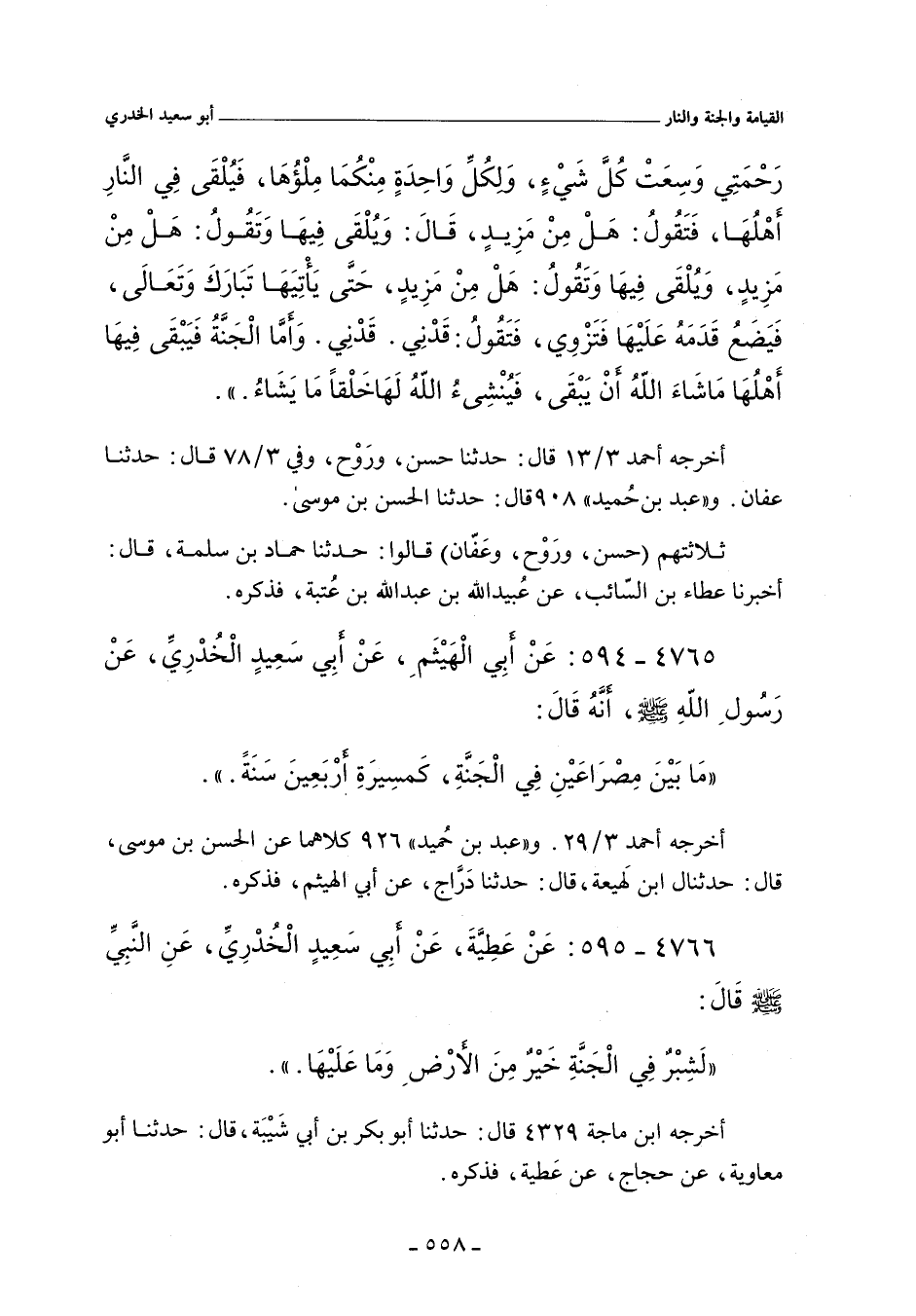 رَحْمَتِى وَسِعَتْ كُلَّ شَىْءٍ وَلِكُلِّ وَاحِدَةٍ مِنْكُمَا مِلْؤُهَا. فَيُلْقَى فِى النَّارِ أَهْلُهَا فَتَقُولُ هَلْ مِنْ مَزِيدٍ قَالَ وَيُلْقَى فِيهَا وَتَقُولُ هَلْ مِنْ مَزِيدٍ وَيُلْقَى فِيهَا وَتَقُولُ هَلْ مِنْ مَزِيدٍ حَتَّى يَأْتِيَهَا تَبَارَكَ وَتَعَالَى فَيَضَعَ قَدَمَهُ عَلَيْهَا فَتُزْوَى فَتَقُولُ قَدْنِى قَدْنِى وَأَمَّا الْجَنَّةُ فَيَبْقَى فِيهَا أَهْلُهَا مَا شَاءَ اللَّهُ أَنْ يَبْقَى فَيُنْشِئُ اللَّهُ لَهَا خَلْقًا مَا يَشَاءُ.