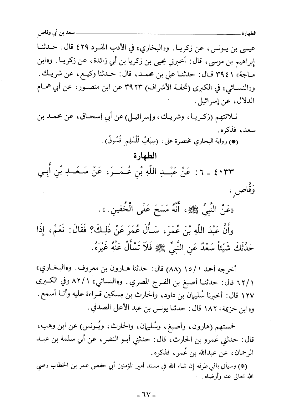 - أخرجه أحمد ١/ ١٤ (٨٧) قال: حدثنا قُتَيْبَة بن سعيد، حدثنا ابن لَهِيعة، عَن أَبي النضر، عن أَبي سلمة، عن ابن عُمر، أنه قال: رأيتُ سعدَ بن أَبي وقَّاصٍ يمسحُ على خُفيه بالعراق، حين يتوضا، فأنكرتُ ذلك عليه. قال: فلما اجتمعنا عند عمر بن الخطاب، قال لي: سل أباك عما أنكرتَ علي من مسح الخفين. قال: فذكرتُ ذلك له. فقال: إذا حدثك سعد بشيءٍ فلا ترد عليه، فإن رسولَ الله صلى الله عليه وسلم كان يمسحُ على الخفين.