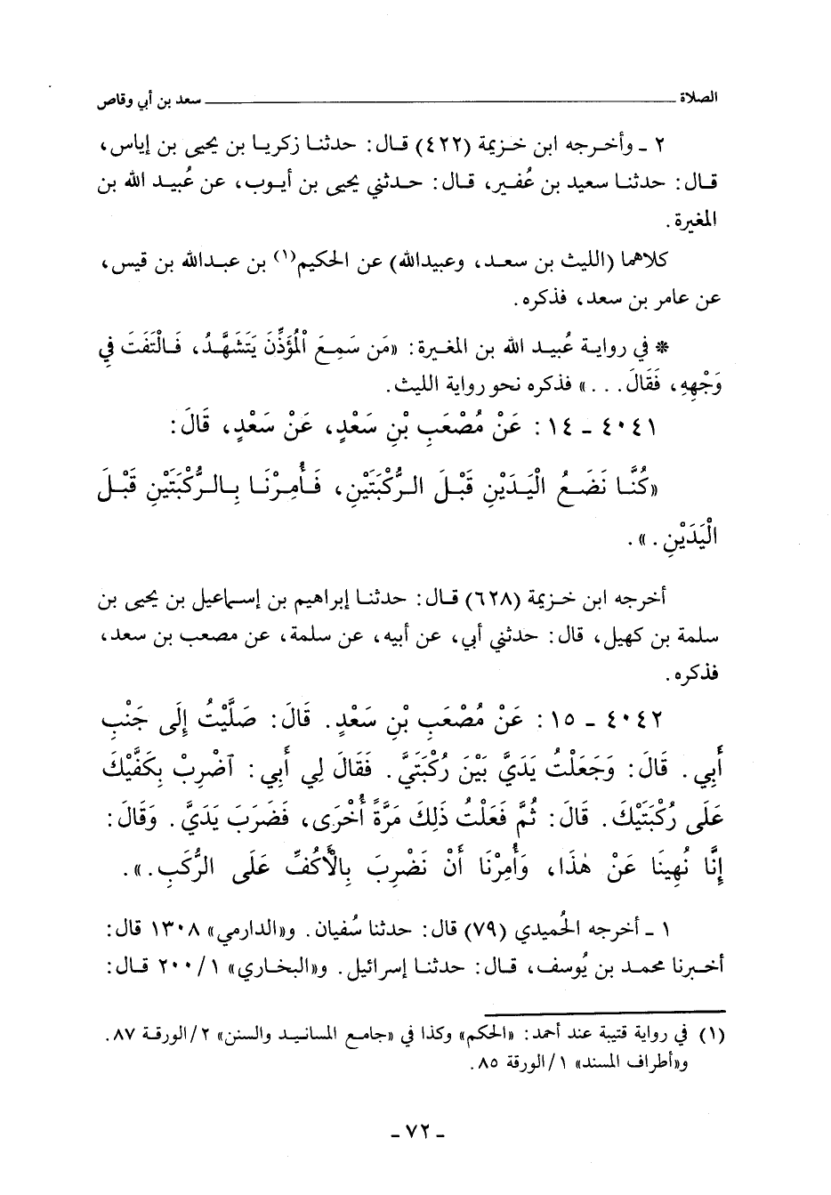 ٤٠٤٢ - عَنْ مُصْعَبِ بْنِ سَعْدٍ. قَالَ: صَلَّيْتُ إِلَى جَنْبِ أَبِى. قَالَ: وَجَعَلْتُ يَدَىَّ بَيْنَ رُكْبَتَىَّ، فَقَالَ لِى أَبِى: اضْرِبْ بِكَفَّيْكَ عَلَى رُكْبَتَيْكَ. قَالَ: ثُمَّ فَعَلْتُ ذَلِكَ مَرَّةً أُخْرَى، فَضَرَبَ يَدَىَّ. وَقَالَ: إِنَّا نُهِينَا عَنْ هَذَا، وَأُمِرْنَا أَنْ نَضْرِبَ بِالأَكُفِّ عَلَى الرُّكَبِ.
