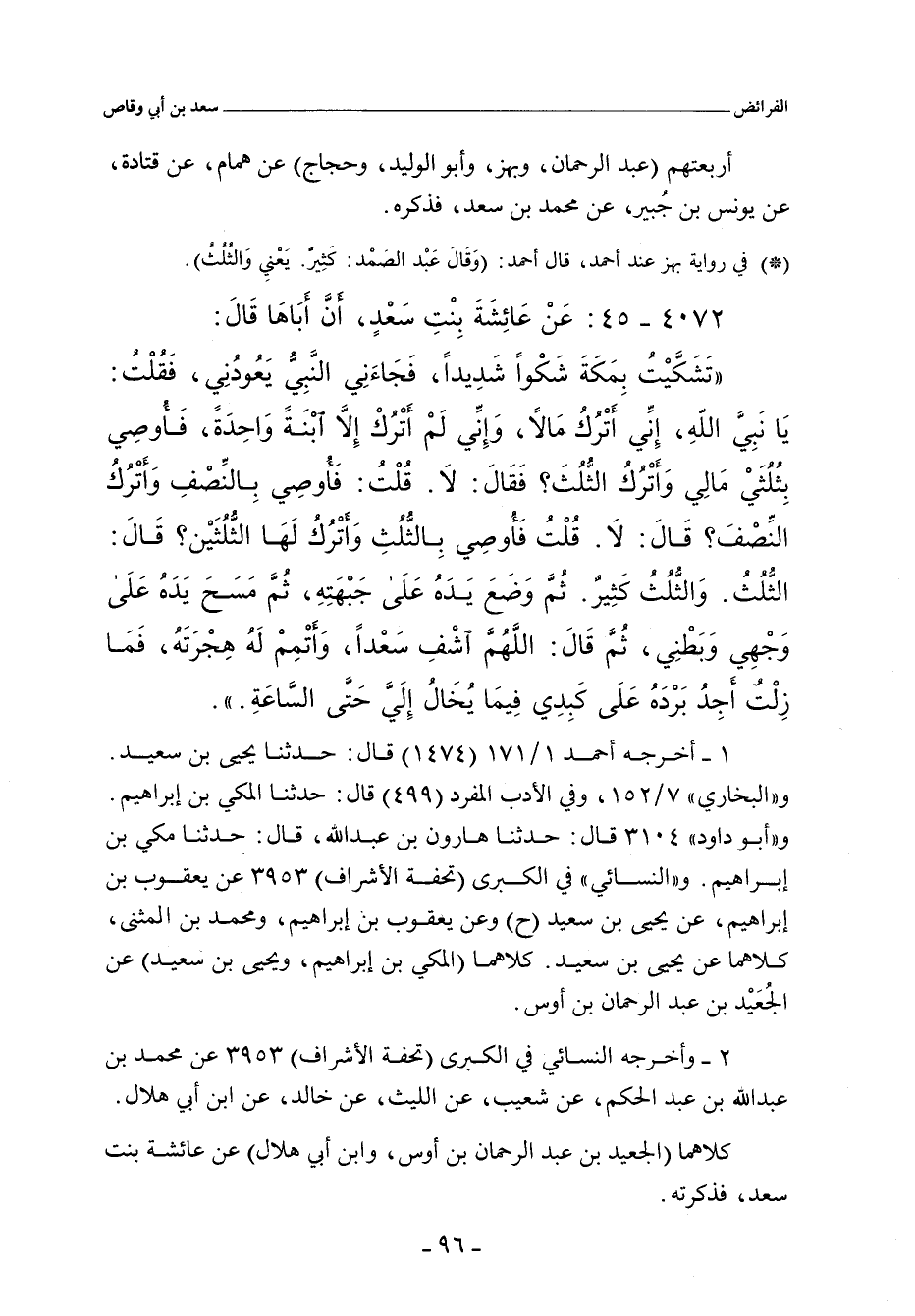 تَشَكَّيْتُ بِمَكَّةَ شَكْوًا شَدِيدًا، فَجَاءَنِى النَّبِىُّ صلى الله عليه وسلم يَعُودُنِى، فَقُلْتُ: يَا نَبِىَّ اللهِ، إِنِّى أَتْرُكُ مَالاً، وَإِنِّى لَمْ أَتْرُكْ إِلَاّ ابْنَةً وَاحِدَةً، فَأُوصِى بِثُلُثَىْ مَالِى وَأَتْرُكُ الثُّلُثَ؟ فَقَالَ: لَا. قُلْتُ: فَأُوصِى بِالنِّصْفِ وَأَتْرُكُ النِّصْفَ؟ قَالَ: لَا. قُلْتُ: فَأُوصِى بِالثُّلُثِ وَأَتْرُكُ لَهَا الثُّلُثَيْنِ قَالَ: الثُّلُثُ وَالثُّلُثُ كَثِيرٌ، ثُمَّ وَضَعَ يَدَهُ عَلَى جَبْهَتِهِ، ثُمَّ مَسَحَ يَدَهُ عَلَى وَجْهِى وَبَطْنِى ثُمَّ قَالَ: اللَّهُمَّ اشْفِ سَعْدًا، وَأَتْمِمْ لَهُ هِجْرَتَهُ، فَمَا زِلْتُ أَجِدُ بَرْدَهُ عَلَى كَبِدِى فِيمَا يُخَالُ إِلَىَّ حَتَّى السَّاعَةِ.