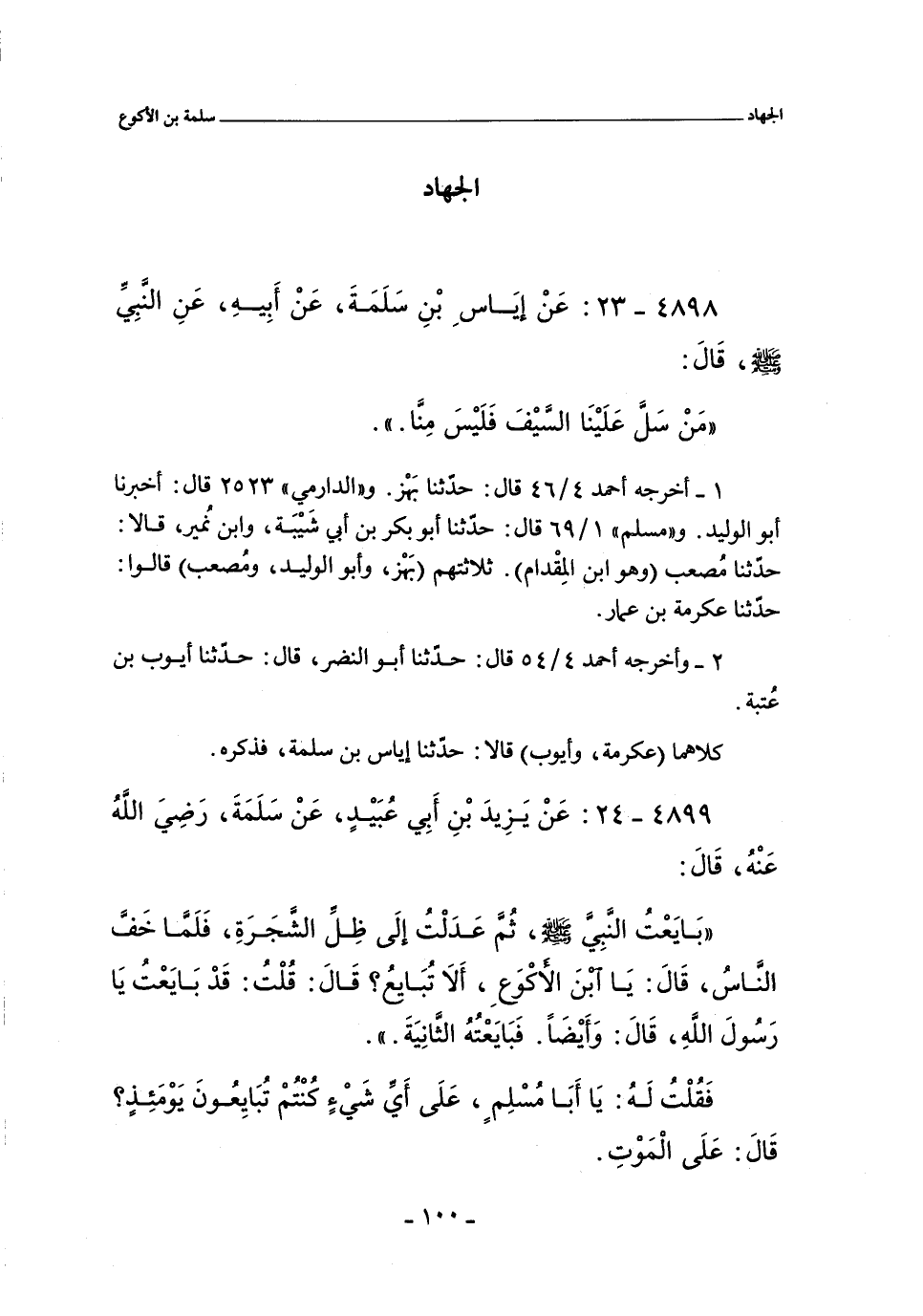 بَايَعْتُ النَّبِىَّ صلى الله عليه وسلم , ثُمَّ عَدَلْتُ إِلَى ظِلِّ الشَّجَرَةِ، فَلَمَّا خَفَّ النَّاسُ , قَالَ: يَا ابْنَ الأَكْوَعِ، أَلَا تُبَايِعُ؟ قَالَ: قُلْتُ: قَدْ بَايَعْتُ يَا رَسُولَ الله , قَالَ: وَأَيْضًا. فَبَايَعْتُهُالثَّانِيَةَ.