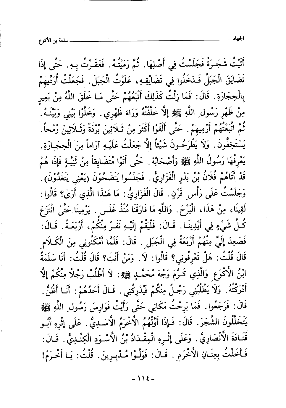 أتيت شجرة فجلست في أصلها , ثم رميته , فعقرت به , حتى إذا تضايق الجبل فدخلوا في تضايقه , علوت الجبل , فجعلت أرديهم بالحجارة. قال: فما زلت كذلك أتبعهم , حتى ما خلق الله من بعير من ظهر رسول الله صلى الله عليه وسلم إِلَاّ خَلَّفْتُهُ وَرَاءَ ظَهْرِى , وخلوا بيني وبينه , ثم أتبعتهم أرميهم , حتى ألقوا أكثر مِنْ ثَلَاثِينَ بُرْدَةً وثلاثين رمحا , يَسْتَخِفُّونَ , ولا يطرحون شَيْئًا إِلَاّ جَعَلْتُ عَلَيْهِ آراما من الحِجَارَةً , يعرفها رسول الله صلى الله عليه وسلم وأصحابه , حتى أتو متضايقا من ثنية , فإذا هم قد أتاهم فلان بن بدر الفزاري , فجلسوا يتضحون (يعني يعتذرون) , وجلست على رأس قرن. قال الفزاري: ما هذا الذي أرى؟ قالوا: لقينا , من هذا , البرح , والله , ما فارقنا منذ غلس , يرمينا حتى انتزع كل شيء في أيدينا. قال: فليقم إليه نفر منكم , أربعة. قال: فصعد إلي منهم أربعة في الجبل. قال: فلما أمكنوني من الكلام , قال: قلت: هل تعرفوني؟ قالوا: لا , ومن أنت؟ قال: قلت: أنا سلمة بن الأكوع , والذي كرم وجه محمد صلى الله عليه وسلم, لا أطلب رجلا منكم إلا أدركته , ولا يطلبني رجل منكم فيدركني. قال أحدهم: أنا أظن. قال: فرجعوا , فما برحت مكاني حتى رأيت فوارس رسول الله صلى الله عليه وسلم يتخللون الشجر. قال: فإذا أولهم الأخرم الأسدي , على إثره أبو قتادة الأنصاري , وعلى إثره المقداد بن الأسود الكندي. قال: فأخذت بعنان الأخرم. قال: فولوا مدبرين. قلت: يا أخرم ,