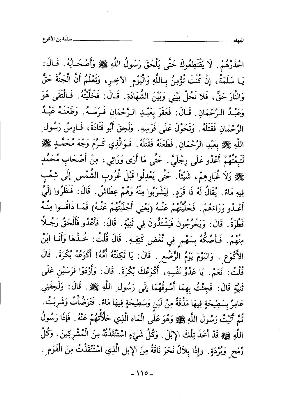 يلحق رسول الله صلى الله عليه وسلم وأصحابه قال يا سلمة , إن كنت تؤمن بالله واليوم الآخر , وتعلم أن الجنة حق , والنار حق , فلا تحل بيني وبين الشهادة. قال: فخليته , فالتقى هو وعبد الرحمن قال: فعقر بعبد الرحمن فرسه , وطعنه عبد الرحمن فقتله , وتحول على فرسه , ولحق أبو قتادة , فارس رسول الله صلى الله عليه وسلم بعبد الرحمن , فطعنه فقتله , فوالذي كرم وجه محمد صلى الله عليه وسلم , لتبعتهم أعدو على رجلي , حتى ما أرى ورائي , من أصحاب محمد صلى الله عليه وسلم ولا غبارهم , شيئا , حتى يعدلوا قبل غروب الشمس إلى شعب فيه ماء , يقال له: ذا قرد , ليشربوا منه وهم عطاش. قال: فنظروا إلى أعدو وراءهم , فحليتهم عنه (يعني أجليتهم عنه) فما ذاقوا منه قطرة. قال: ويخرجون فيشتدون في ثنية. قال: فأعدو فألحق رجلا منهم , فأصكه بسهم في نغض كتفه. قال: قلت: خذها وأنا بن الأكوع , واليوم يوم الرضع. قال: يا ثكلته أمه , أكوعه بكرة. قال: قلت: نعم , ياعدو نفسه , أكوعك بكرة. قال: وأردوا فرسين على ثنية. قال فجئت بهما أسوقهما إلى رسول الله صلى الله عليه وسلم. قال: ولحقني عامر بسطيحة فيها مذقة من لبن , وسطيحة فيها ماء , فتوضأت وشربت , ثم أتيت رسول الله صلى الله عليه وسلم , وهو على الماء الذي حلأتهم عنه , فإذا رسول الله صلى الله عليه وسلم قد أخذ تلك الإبل , وكل شيء استنقذته من المشركين , وكل رمح وبردة , وإذا بلال نحر ناقة من الإبل الذي استنقذت من القوم ,