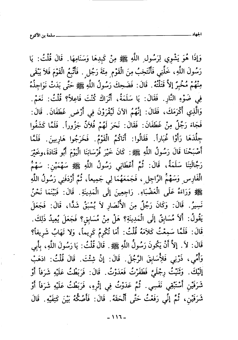 نحر لهم فلان جزورا , فلما كشفوا جلدها رأوا غبارا , فقالوا: أتاكم القوم , فخرجوا هاربين , فلما أصبحنا قال رسول الله صلى الله عليه وسلم: كان خير فرساننا اليوم أبو قتادة , وخير رجالتنا سلمة , قال: ثم أعطاني رسول الله صلى الله عليه وسلم سهمين؛ سهم الفارس وسهم الراجل , فجمعهما لي جميعا , ثم أردفني رسول الله صلى الله عليه وسلم وراءه على العضباء , راجعين إلى المدينة. قال: فبينما نحن نسير. قال: وكان رجل من الأنصار لا يسبق شدا , قال: فجعل يقول: ألا مسابق إلى المدينة؟ هل من مسابق؟ جعل يعيد ذلك. قال: فلما سمعت كلامه قلت: أما تكرم كريما , ولا تهاب شريفا؟ قال: لا , إلا أن يكون رسول الله صلى الله عليه وسلم. قال: قلت: يا رسول الله صلى الله عليه وسلم , بأبي وأمي , ذرني فلأسابق الرجل. قال: إن شئت. قال: قلت: اذهب إليك , وثنيت رجلي , فطفرت فعدوت. قال: فربطت عليه شرفا , أو شرفين , أستبقي نفسي , ثم عدوت في إثره , فربطت عليه شرفا , أو شرفين , ثم إني رفعت حتى ألحقه. قال: فأصكه بين كتفيه. قال: