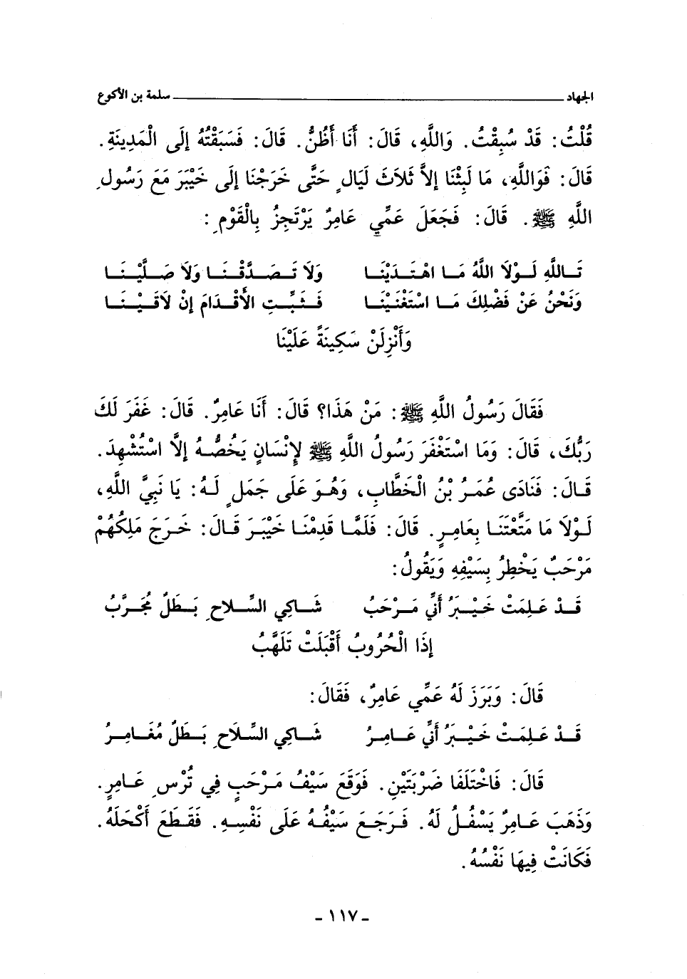 فقال رسول الله صلى الله عليه وسلم: من هذا؟ قال: أناعامر. قال: غفر لك ربك , قال: وما استغفر رسول الله صلى الله عليه وسلم لإنسان يخصه إلا استشهد. قال: فنادى عمر بن الخطاب , وهو على جمل له: يا نبي الله لولا ما متعتنا بعامر. قال: فلما قدمنا خيبر قال: خرج ملكهم مرحب يخطر بسيفه , ويقول: