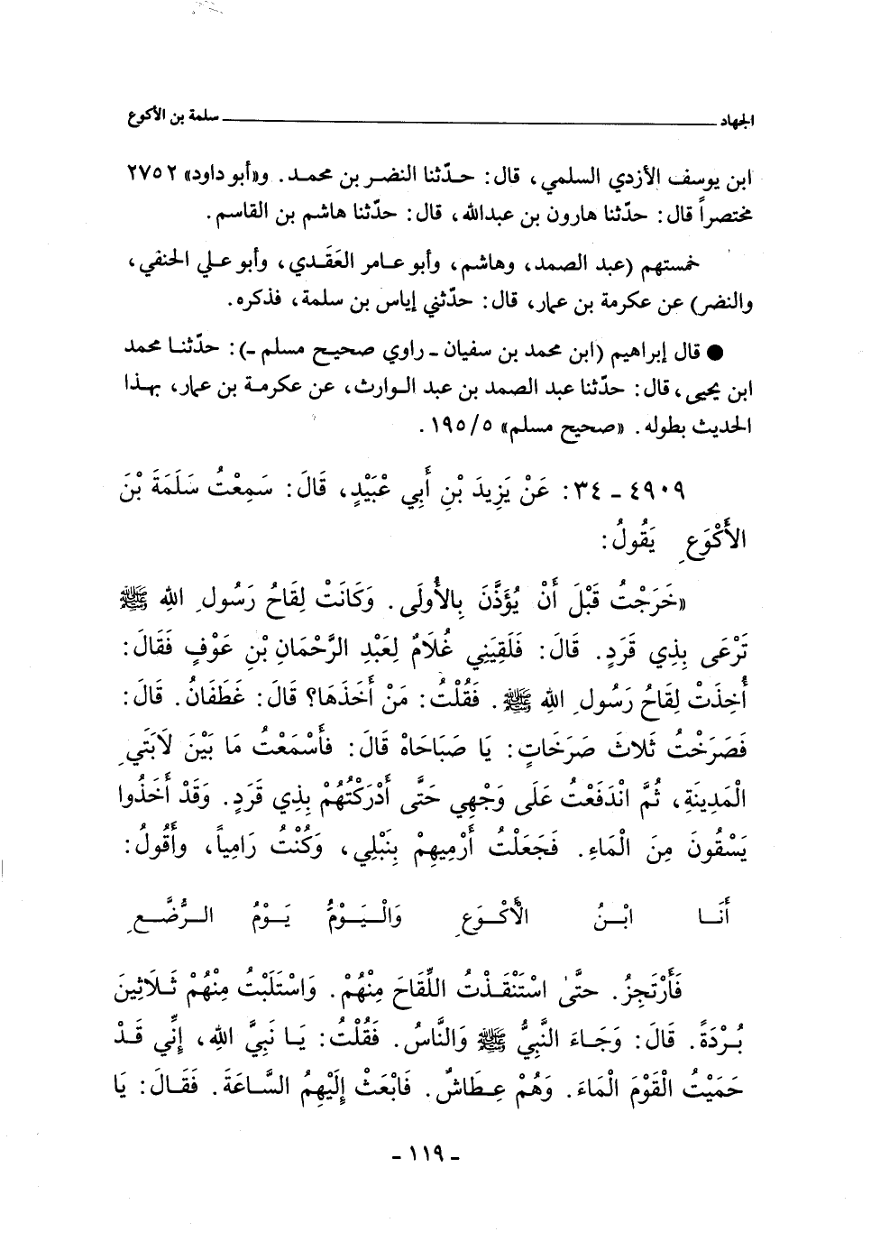 فَأَرْتَجِزُ , حَتَّى اسْتَنْقَذْتُ اللِّقَاحَ مِنْهُمْ , وَاسْتَلَبْتُ مِنْهُمْ ثَلَاثِينَ بُرْدَةً. قَالَ: وَجَاءَ النَّبِىُّ صلى الله عليه وسلم وَالنَّاسُ. فَقُلْتُ: يَا نَبِىَّ الله , إِنِّى قَدْ حَمَيْتُ الْقَوْمَ الْمَاءَ , وَهُمْ عِطَاشٌ , فَابْعَثْ إِلَيْهِمُ السَّاعَةَ. فَقَالَ: يَا