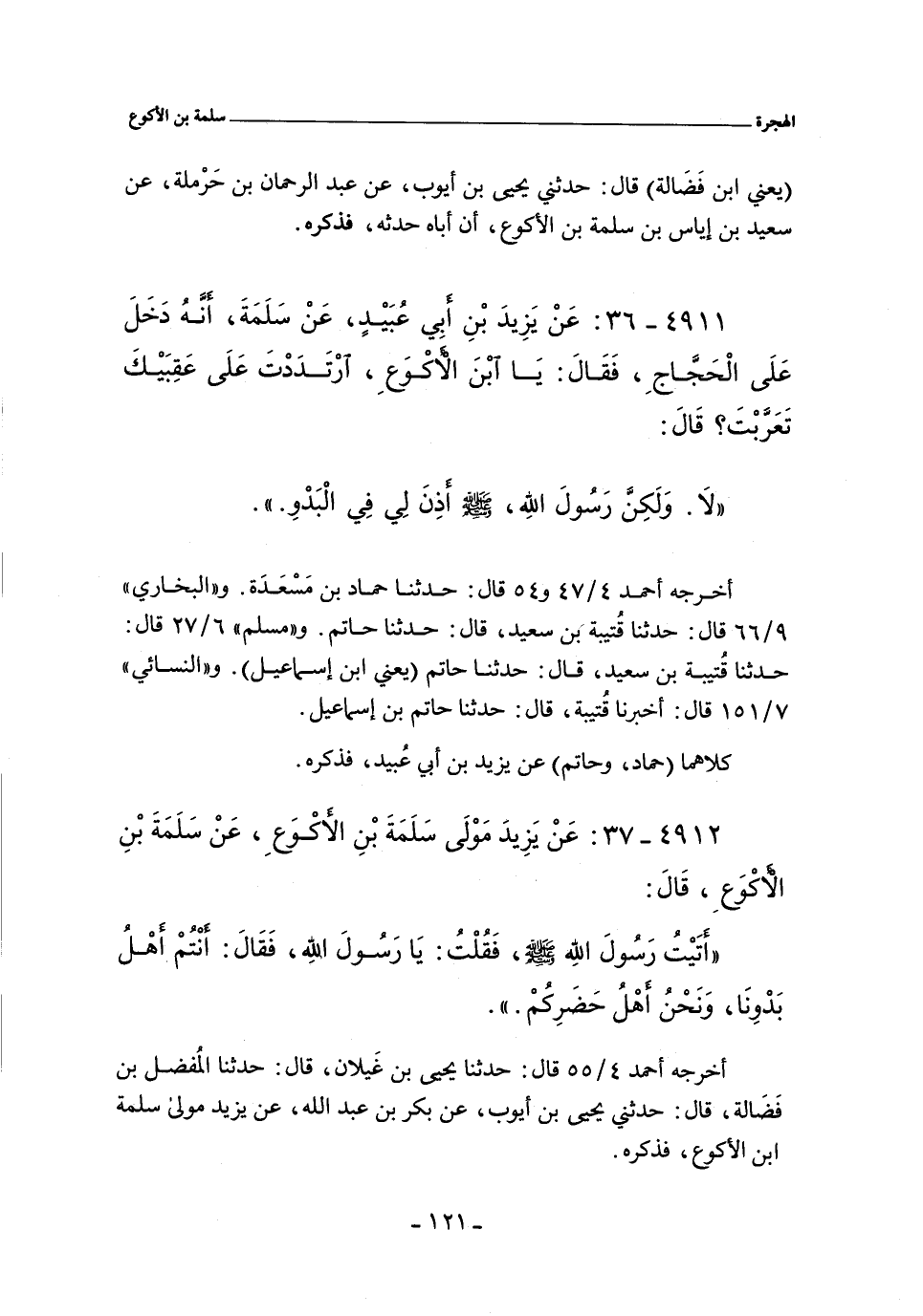 ٤٩١١ - عَنْ يَزِيدَ بْنِ أَبِى عُبَيْدٍ، عَنْ سَلَمَةَ، أَنَّهُ دَخَلَ عَلَى الْحَجَّاجِ، فَقَالَ يَا ابْنَ الأَكْوَعِ ارْتَدَدْتَ عَلَى عَقِبَيْكَ تَعَرَّبْتَ؟ قَالَ: