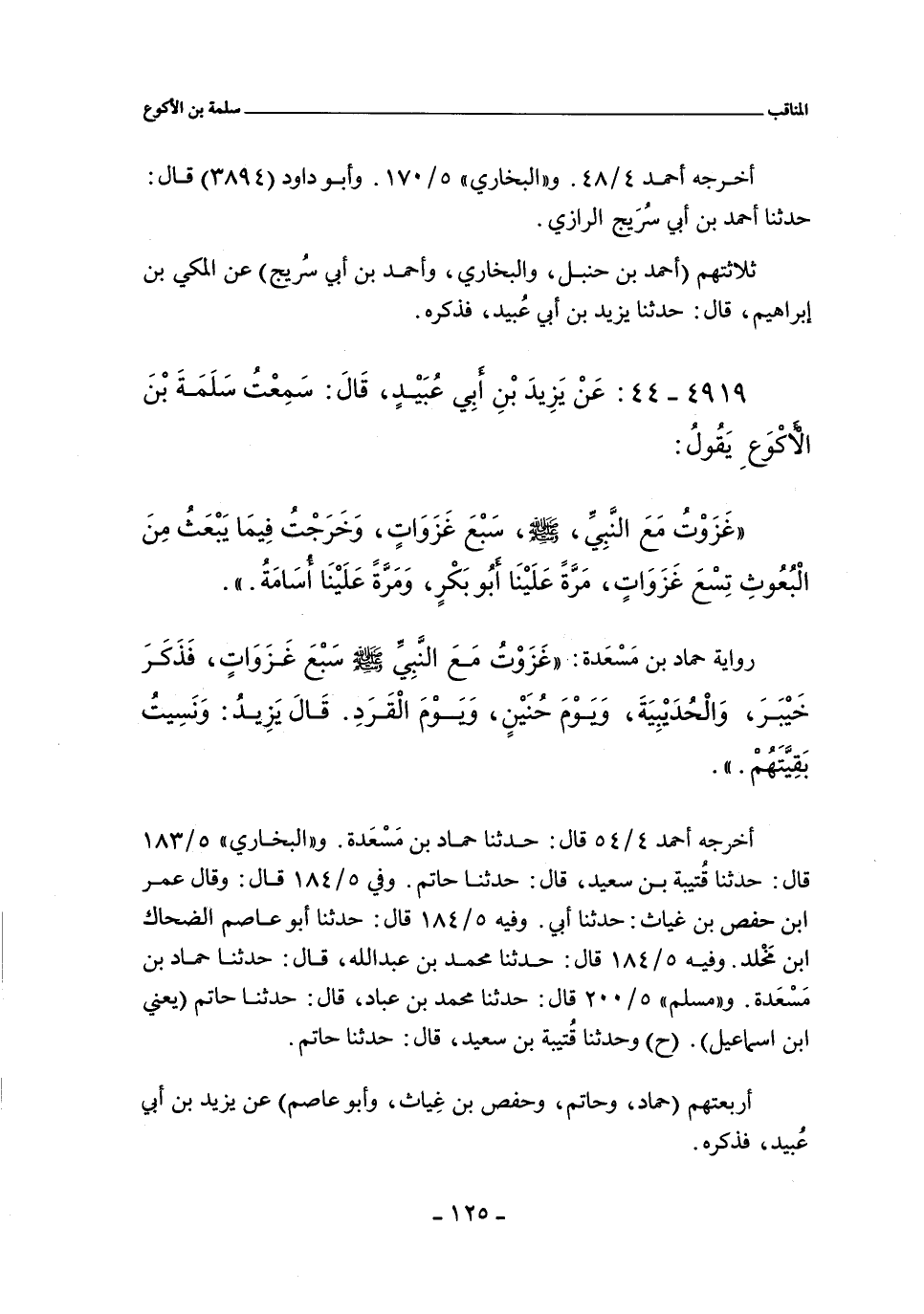 (*) وفي رواية: غزوت مع النبي صلى الله عليه وسلم سبع غزوات، فَذَكَرَ خَيبَرَ، وَالْحُدَيبِيَةَ، وًيوْمَ حُنَينٍ، وَيَومَ الْقَرَدِ. قَالَ يَزِيدُ: وَنَسِيتُ بَقِثتَهُنم.