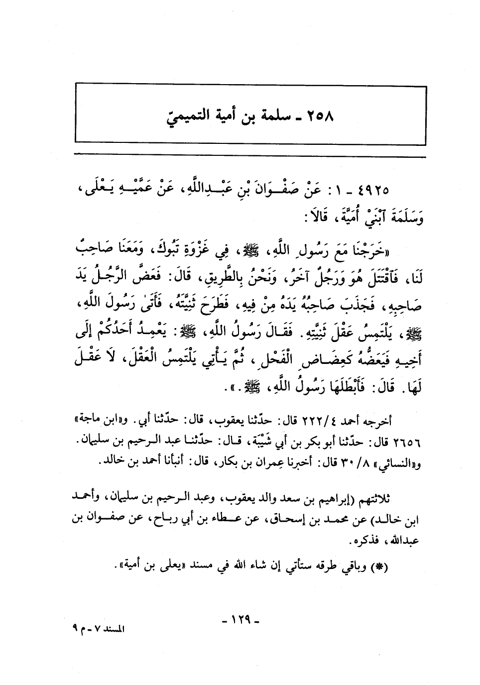 خَرَجْنَا مَعَ رَسُولِ اللهِ صلى الله عليه وسلم فِي غَزْوَةِ تَبُوكَ، وَمَعَنَا صَاحِبٌ لَنَا، فَاقْتَتَلَ هُوَ وَرَجُلٌ آخَرُ، وَنَحْنُ بِالطَّرِيقِ، قَالَ: فَعَضَّ الرَّجُلُ يَدَ صَاحِبِهِ، فَجَذَبَ صَاحِبُهُ يَدَهُ مِنْ فِيهِ، فَطَرَحَ ثَنِيَّتَهُ، فَأَتَى رَسُولَ اللهِ صلى الله عليه وسلم يَلْتَمِسُ عَقْلَ ثَنِيَّتِهِ، فَقَالَ رَسُولُ اللهِ صلى الله عليه وسلم: يَعْمِدُ أَحَدُكُمْ إِلَى أَخِيهِ فَيَعَضُّهُ كَعِضَاضِ الْفَحْلِ، ثُمَّ يَأْتِي يَلْتَمِسُ الْعَقْلَ، لَا عَقْلَ لَهَا، قَالَ: فَأَبْطَلَهَا رَسُولُ اللهِ صلى الله عليه وسلم. (