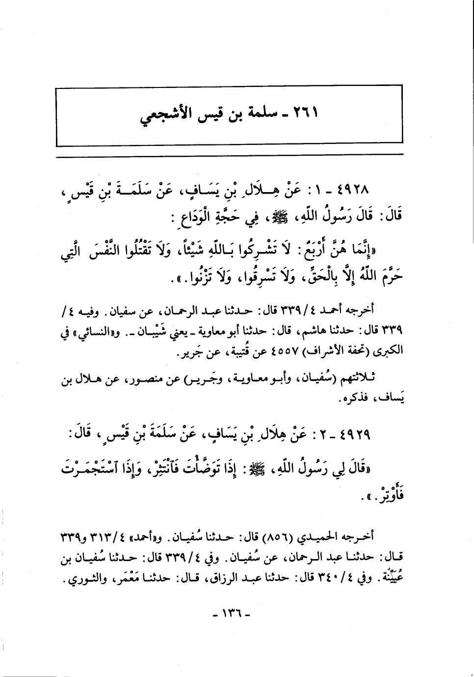 ٤٩٢٩ - عَن هِلَالِ بن يَسَاف، عَن سَلَمَةَ بن قَيسِ، قَالَ: