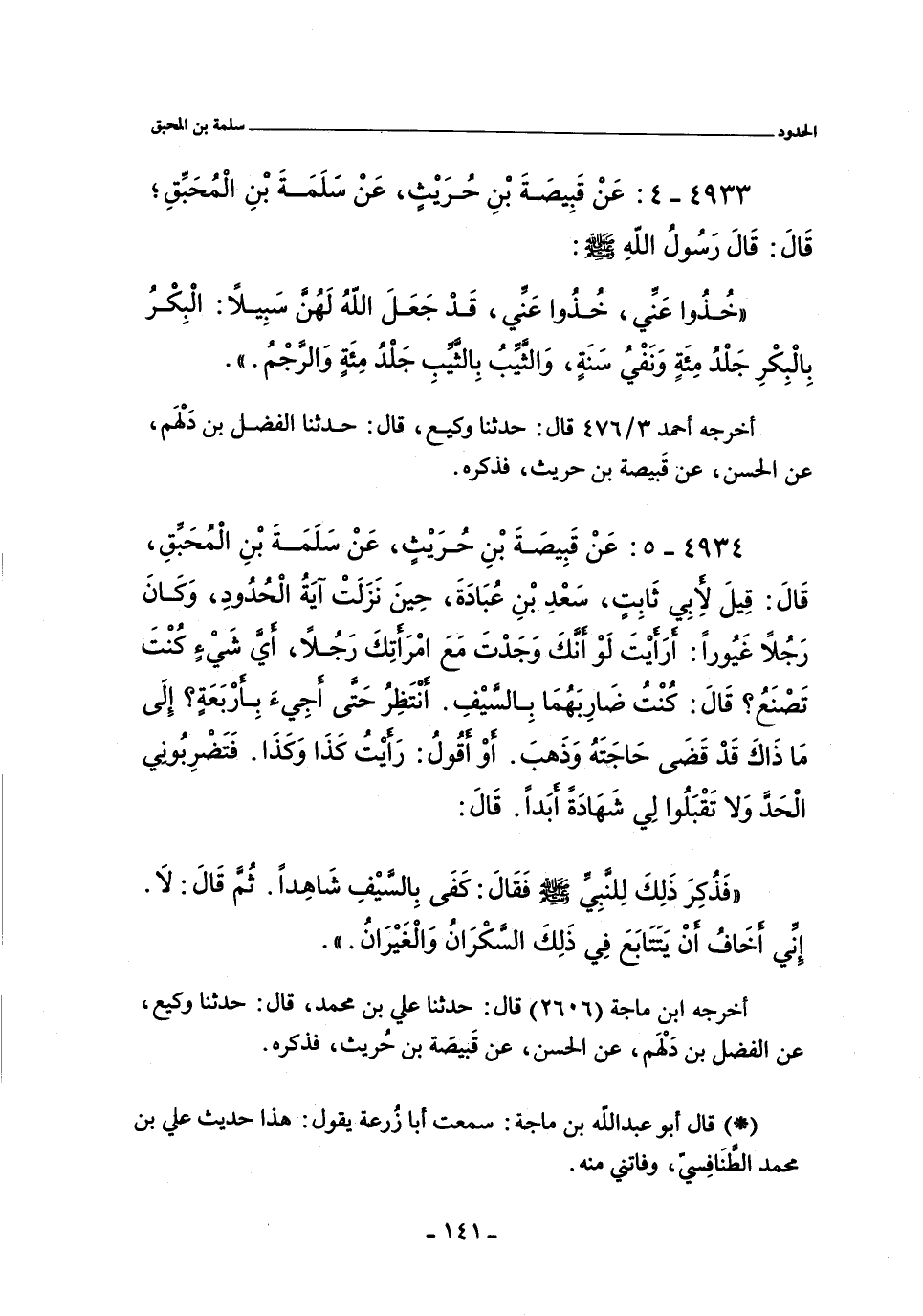 خُذُوا عَنِّى خُذُوا عَنِّى قَدْ جَعَلَ الله لَهُنَّ سَبِيلاً الْبِكْرُ بِالْبِكْرِ جَلْدُ مِائَةٍ وَنَفْىُ سَنَةٍ وَالثَّيِّبُ بِالثَّيِّبِ جَلْدُ مِائَةٍ وَالرَّجْمُ.