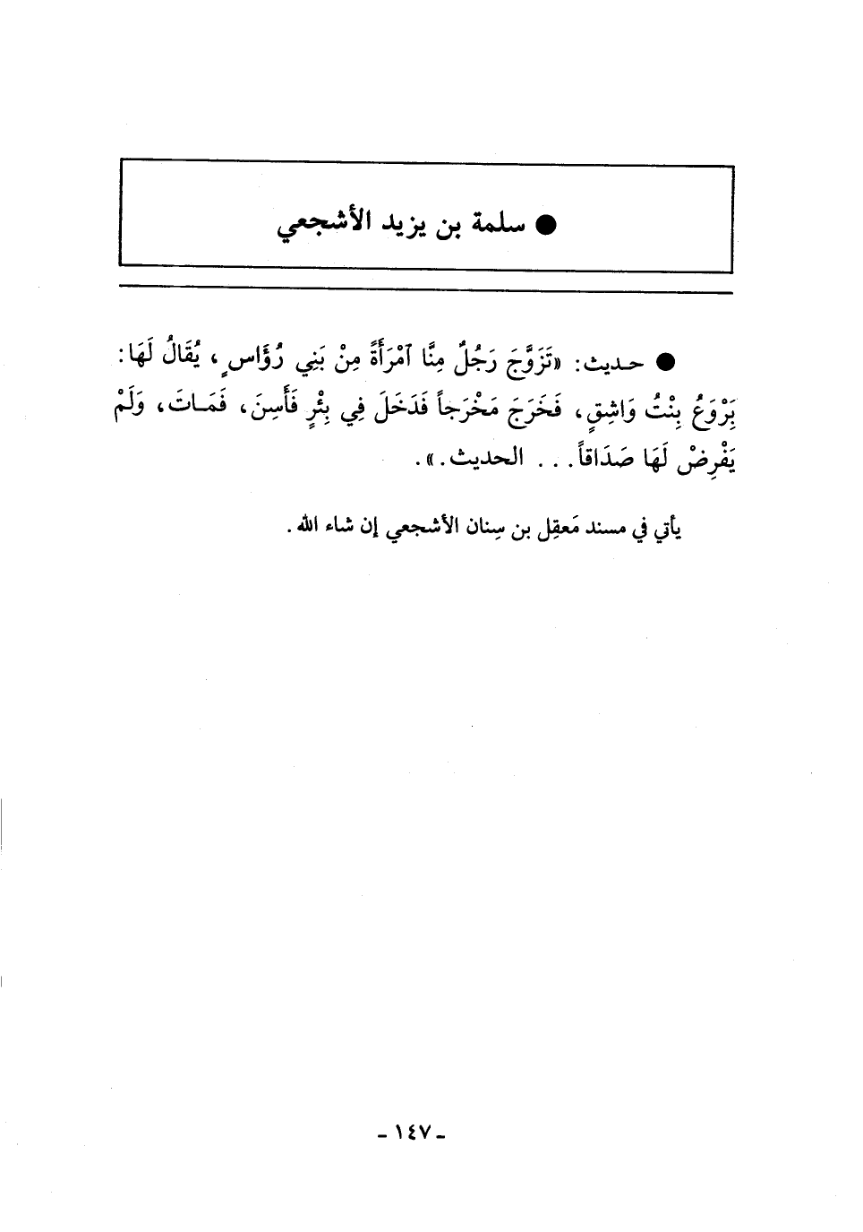 - حديث: تزوج رجل منا امرأة من بني رؤاس , يقال لها: بروع بنت واشق , فخرج مخرجا فدخل في بئر فأسن , فمات , ولم يفرض لها صداقا. الحديث.