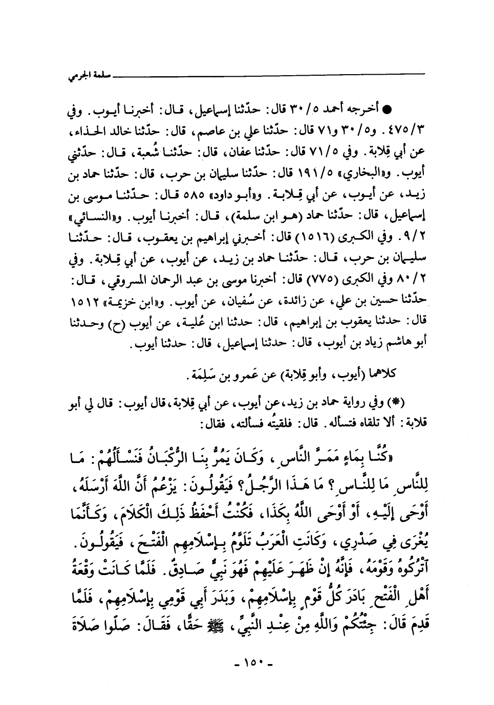 كلاهما (البخاري، وإبراهيم بن يعقوبِ) قالا: حدثنا سُلَيْمَان بنِ حرب، حدثنا حماد بن زيد، عن أيوب، عن أَبي قِلَابة، عَن عَمرِو بن سَلِمَةَ (قَالَ أيُوبُ: قَالَ لِي أبو قِلَابَةَ: ألَا تَلقَاهُ فَتسألَهُ. قَالَ: فَلَقِيتُهُ فَسَألتُهُ. فَقَالَ:)