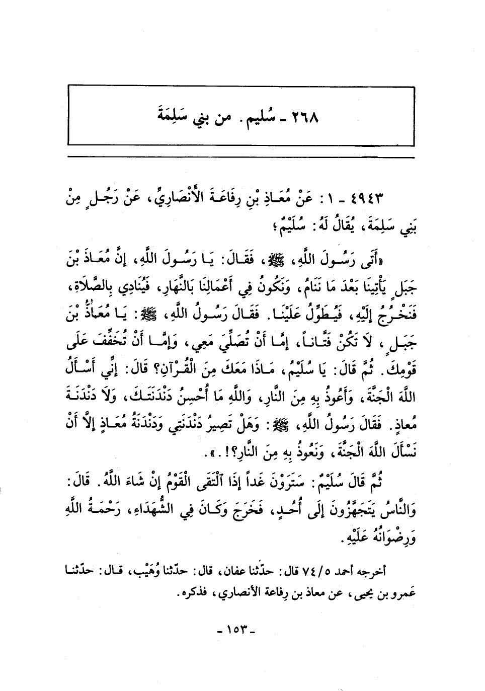 ٤٩٤٣ - عَنْ مُعَاذِ بْنِ رِفَاعَةَ الأَنْصَارِيِّ , عَنْ رَجُلٍ مِنْ بَنِى سَلِمَةَ , يُقَالُ لَهُ: سُلَيْمٌ؛ (أَتَى رَسُولَ الله , صلى الله عليه وسلم , فَقَالَ: يَا رَسُولَ الله , إِنَّ مُعَاذَ بْنَ جَبَلٍ يَأْتِينَا بَعْدَ مَا نَنَامُ , وَنَكُونُ فِى أَعْمَالِنَا بِالنَّهَارِ , فَيُنَادِي بِالصَّلَاةِ , فَنَخْرُجُ إِلَيْهِ , فَيُطَوِّلُ عَلَيْنَا. فَقَالَ رَسُولُ الله , صلى الله عليه وسلم: يَا مُعَاذُ بْنَ جَبَلٍ , لَا تَكُنْ فَتَّانًا , إِمَّا أَنْ تُصَلِّىَ مَعِي , وَإِمَّا أَنْ تُخَفِّفَ عَلَى قَوْمِكَ. ثُمَّ قَالَ: يَا سُلَيْمُ , مَاذَا مَعَكَ مِنَ الْقُرْآنِ؟ قَالَ: إِنِّى أَسْأَلُ الله الْجَنَّةَ , وَأَعُوذُ بِهِ مِنَ النَّارِ , وَالله مَا أُحْسِنُ دَنْدَنَتَكَ , وَلَا دَنْدَنَةَ مُعَاذٍ. فَقَالَ رَسُولُ الله , صلى الله عليه وسلم: وَهَلْ تَصِيرُ دَنْدَنَتِى وَدَنْدَنَةُ مُعَاذٍ إِلَاّ أَنْ نَسْأَلَ الله الْجَنَّةَ , وَنَعُوذَ بِهِ مِنَ النَّارِ؟!.