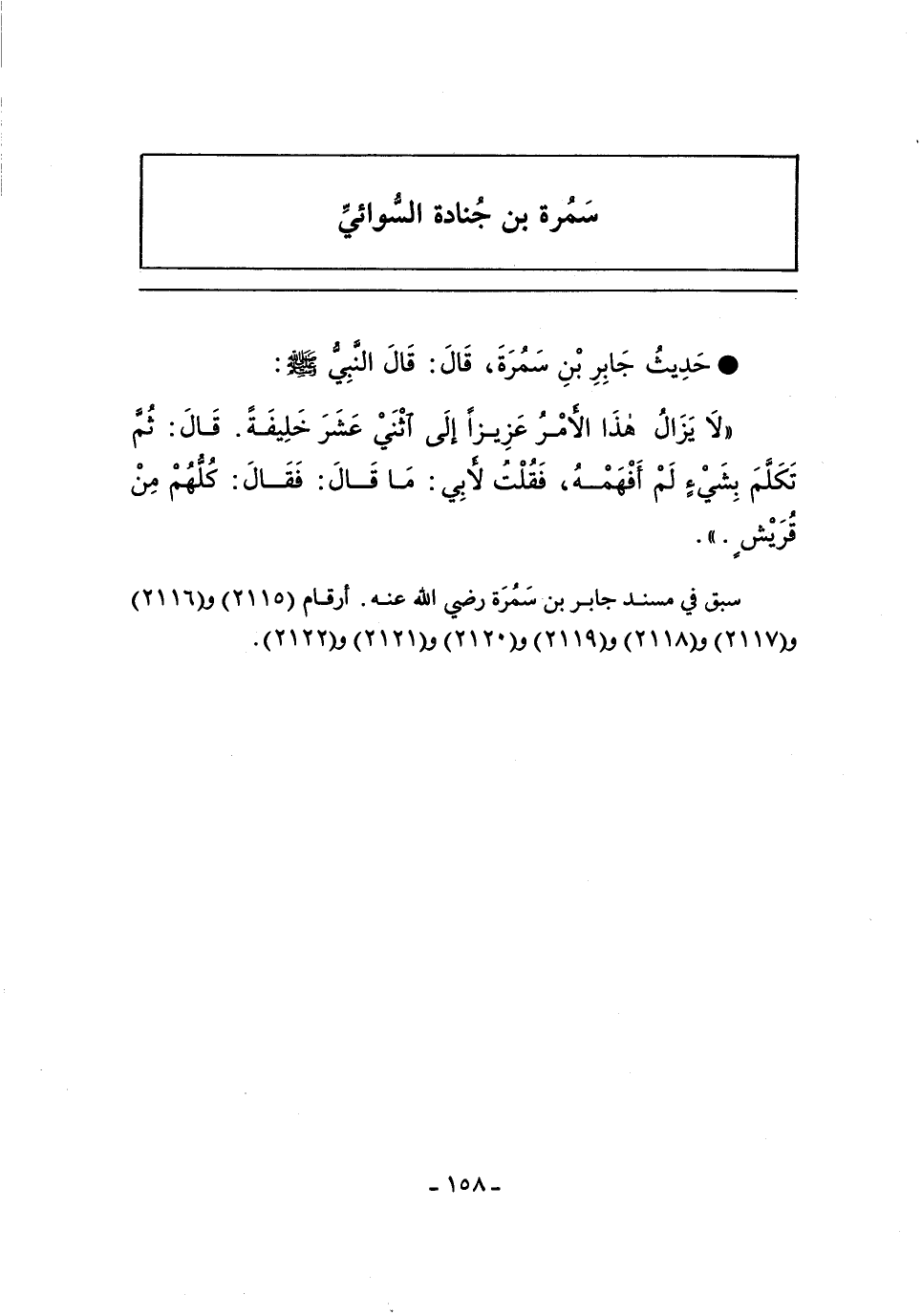 سبق في مسند جابر بن سمرة رضي الله عنه. أرقام (٢١١٥ و ٢١١٦ و ٢١١٧ و ٢١١٨ و ٢١١٩ و ٢١٢٠ و ٢١٢١ و ٢١٢٢.